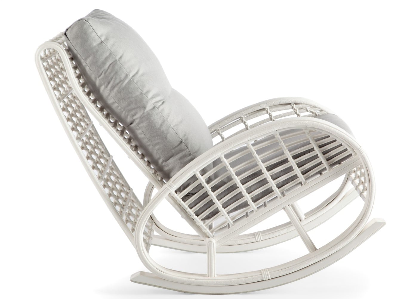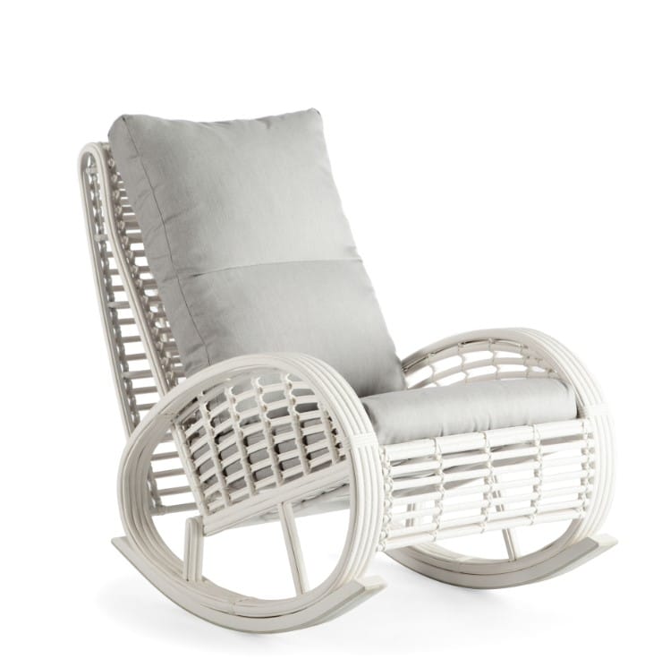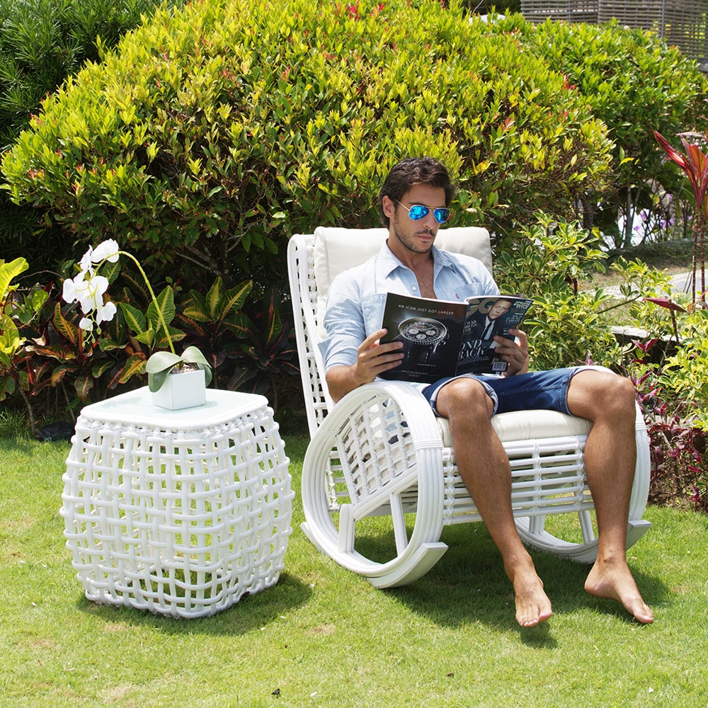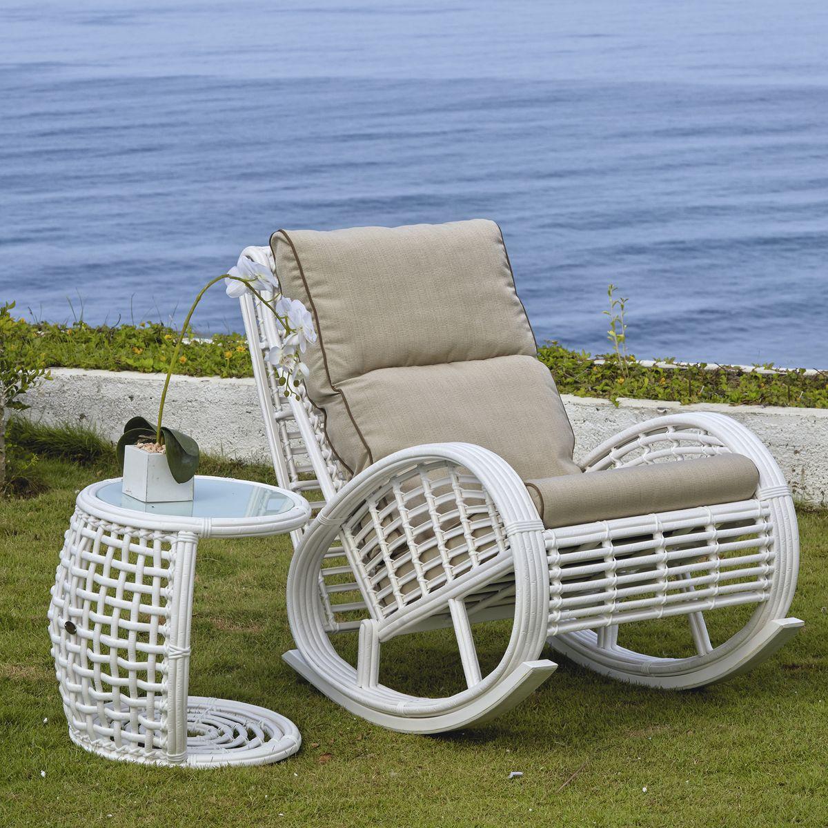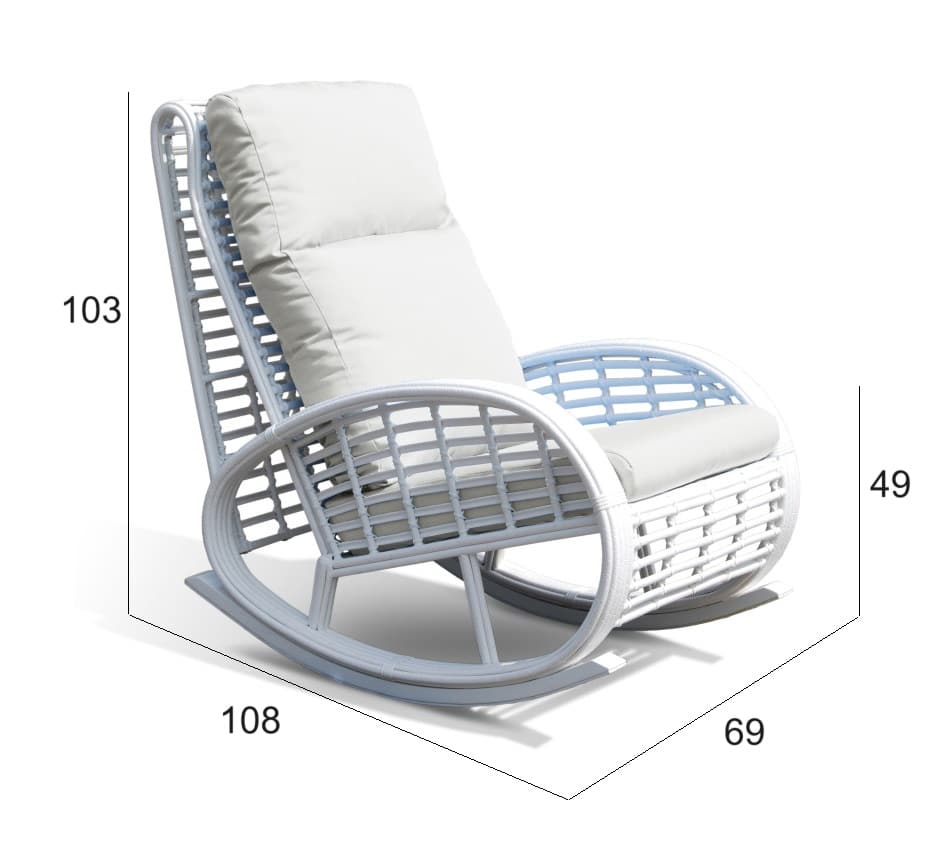 Splot wykonany jest z technorattanu WHITE MUSHROOM 15 mm , kolor biały, na malowanej aluminiowej ramie wytrzyma każde warunki pogodowe, co pozwoli na korzystanie z fotela bujanego przez cały rok. Grube i miękkie poduszki są pokryte wodoodporną tkaniną.