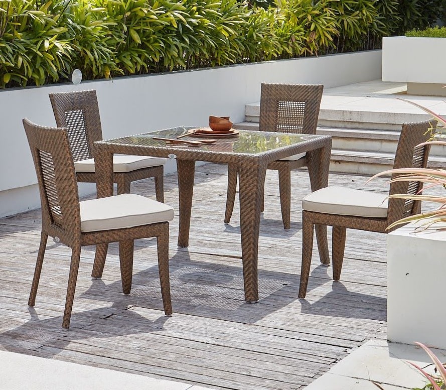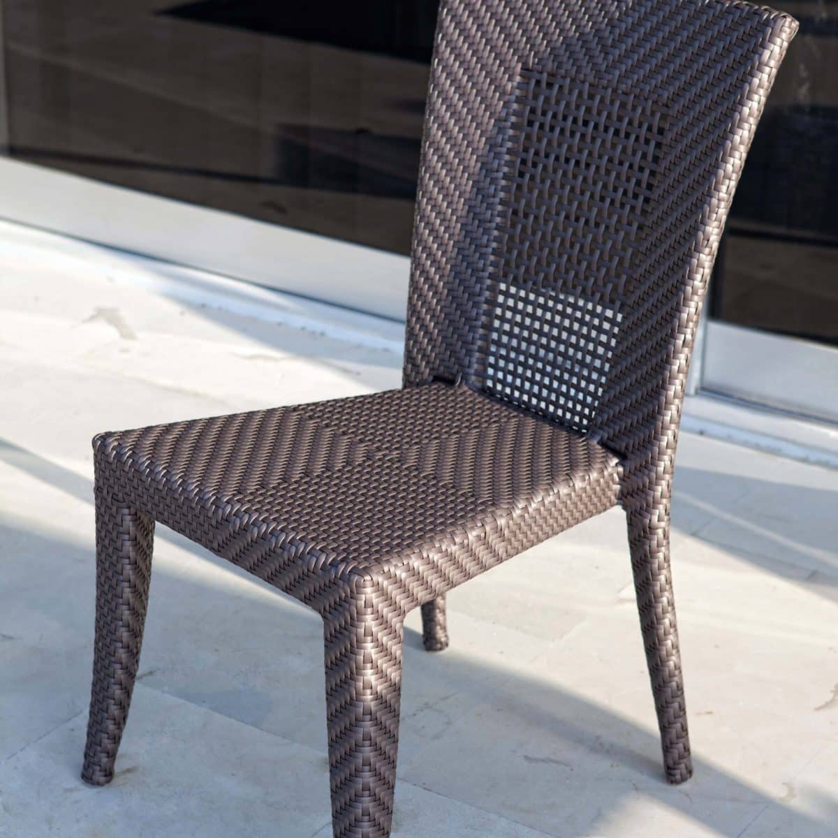 Oryginalna i skomplikowana technika splotu w formie choinki w połączeniu z ażurową siatką, bogaty brązowy kolor technorattanu z odcieniem brązu, nietypowy kształt nóżek i podłokietników – to wszystko łączy się w meblach z kolekcji MADISON BRONZE.