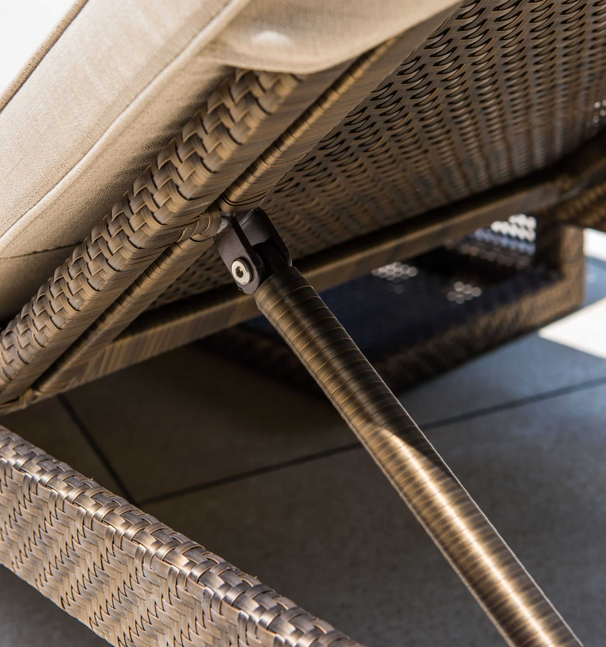 Rama wykonana jest z malowanego aluminium. Splot – technorattan BRONZE 7 MM FLAT-FLAT w brązowym kolorze z brązowym połyskiem. Wysokie i miękkie poduszki są pokryte wodoodporną tkaniną.