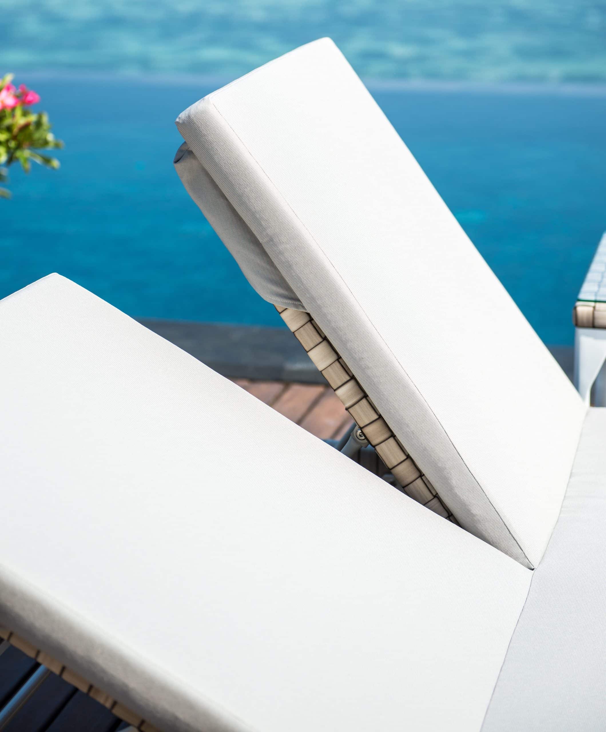 Rama wykonana z aluminium malowanego na biało. Splot wykonany jest z technorattanu SEASHELL FLAT-FLAT 30 mm, w przyjemnym beżowym kolorze z brązowym odcieniem. Wysokie i miękkie poduszki są pokryte wodoodporną tkaniną.