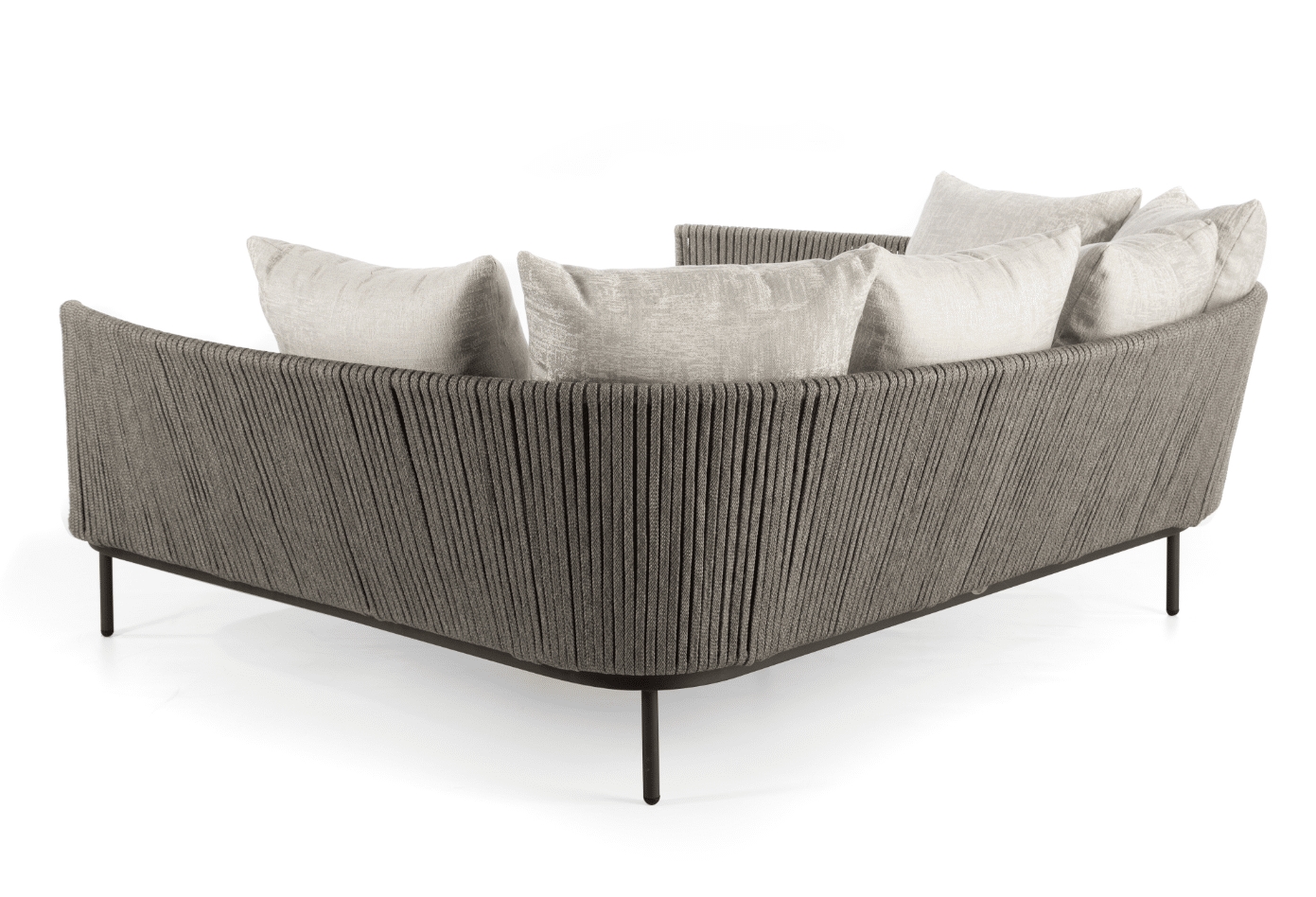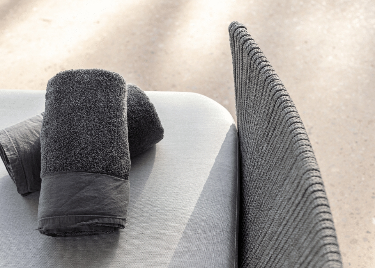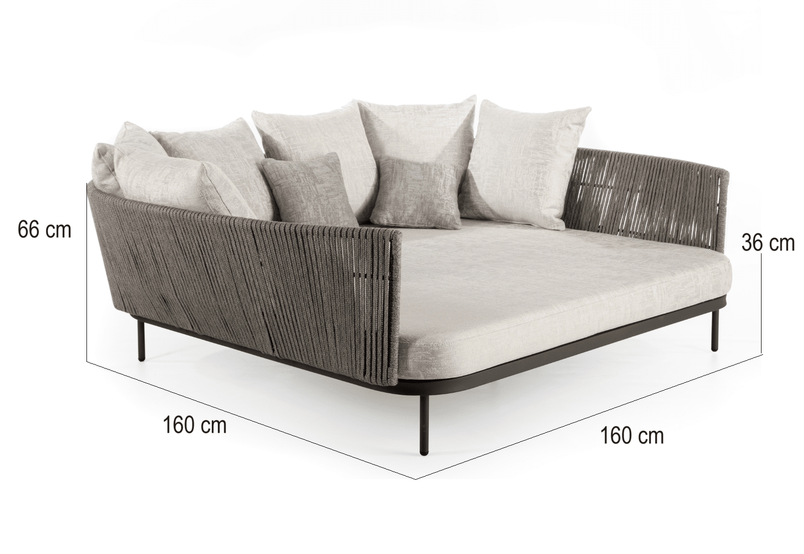 Rama wykonana jest z malowanego aluminium, kolor CARBON MATTE. Splot – sznurek poliestrowy LIGHT GREY 16×5 mm. Wysokie i miękkie poduszki są pokryte wodoodporną tkaniną.