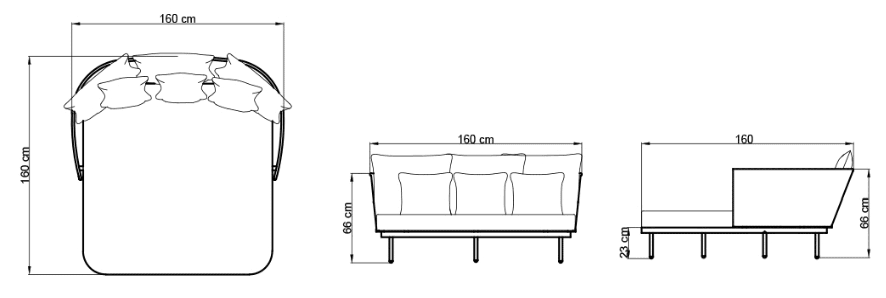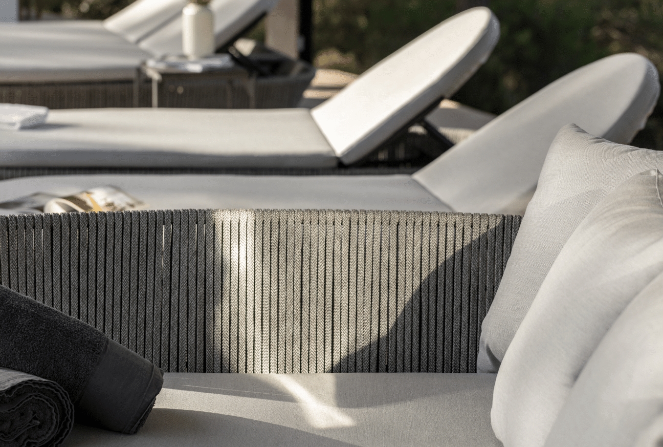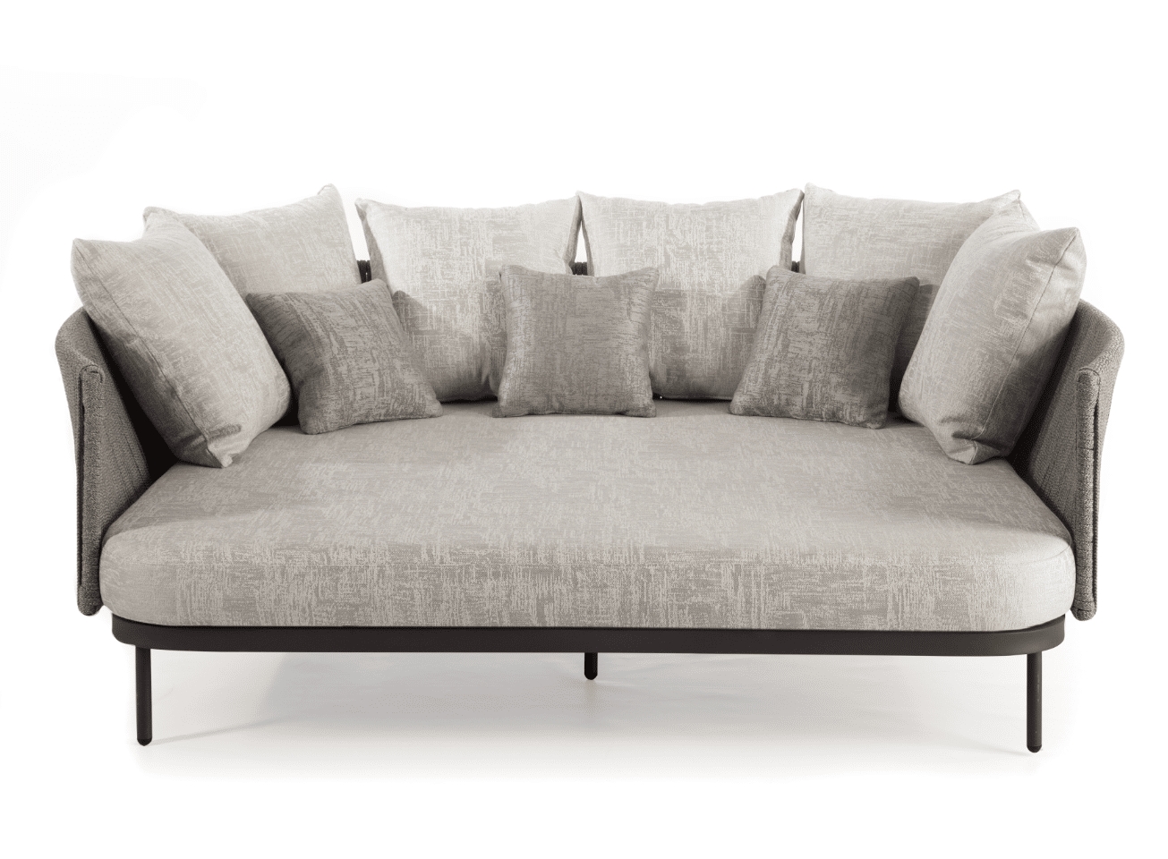 Rama wykonana jest z malowanego aluminium, kolor CARBON MATTE. Splot – sznurek poliestrowy LIGHT GREY 16×5 mm. Wysokie i miękkie poduszki są pokryte wodoodporną tkaniną.