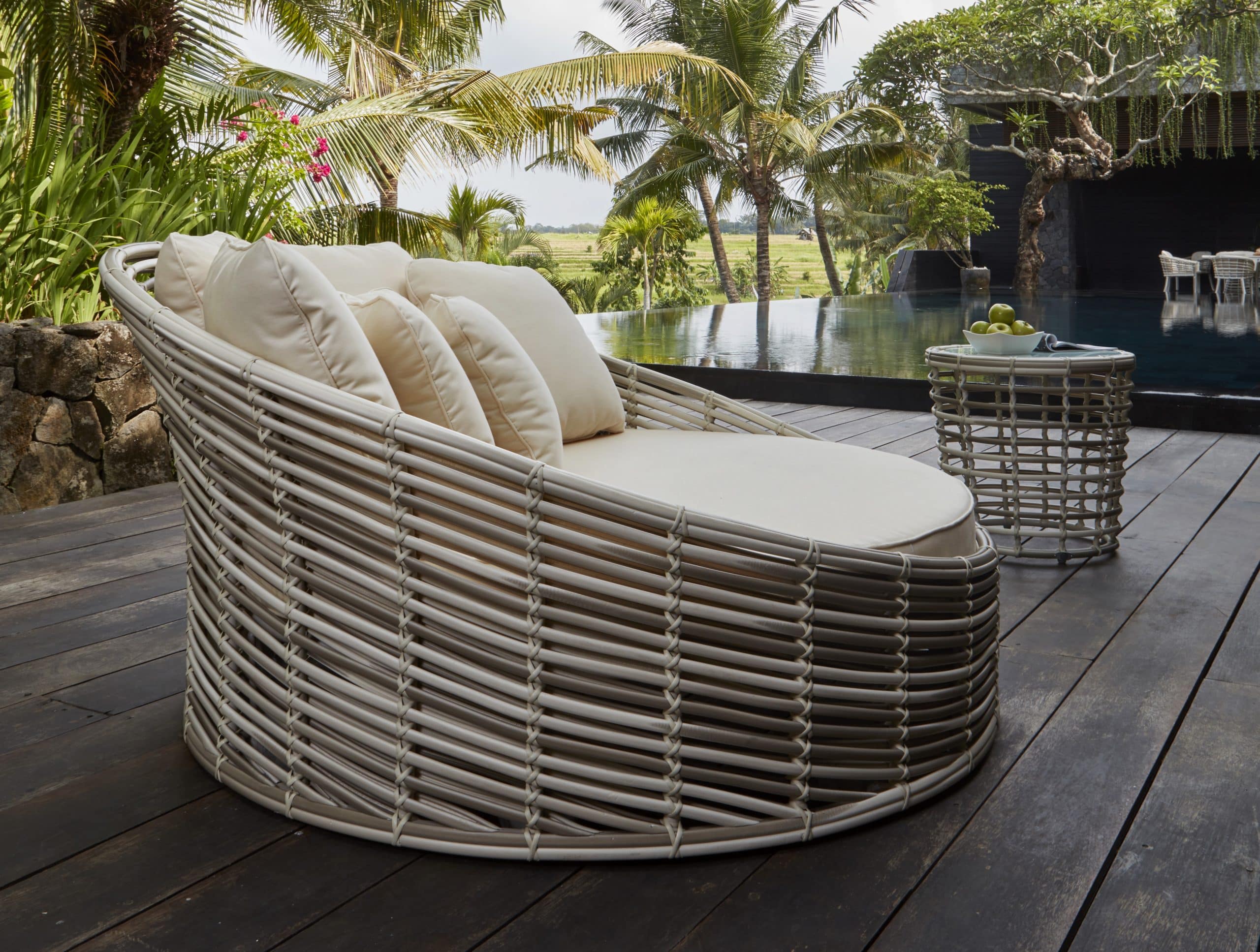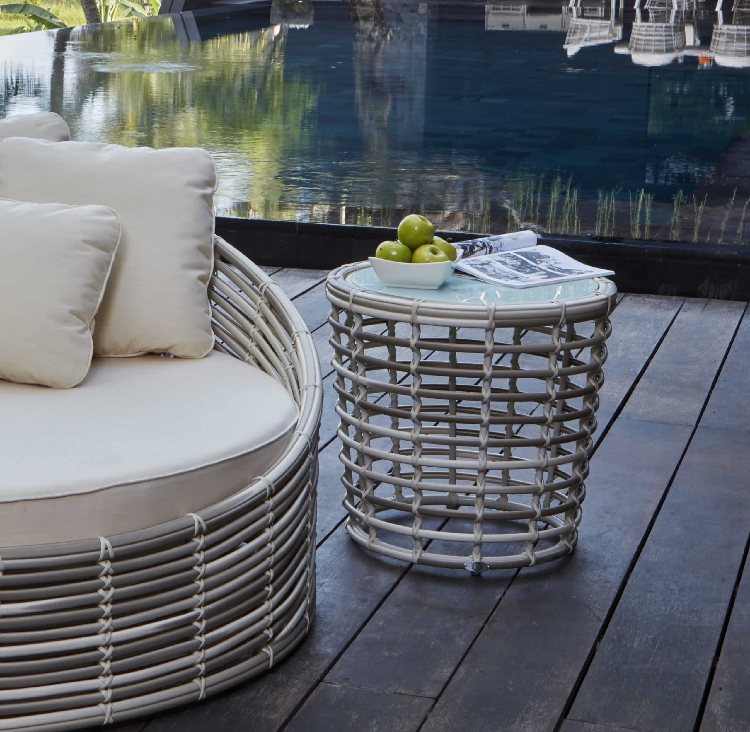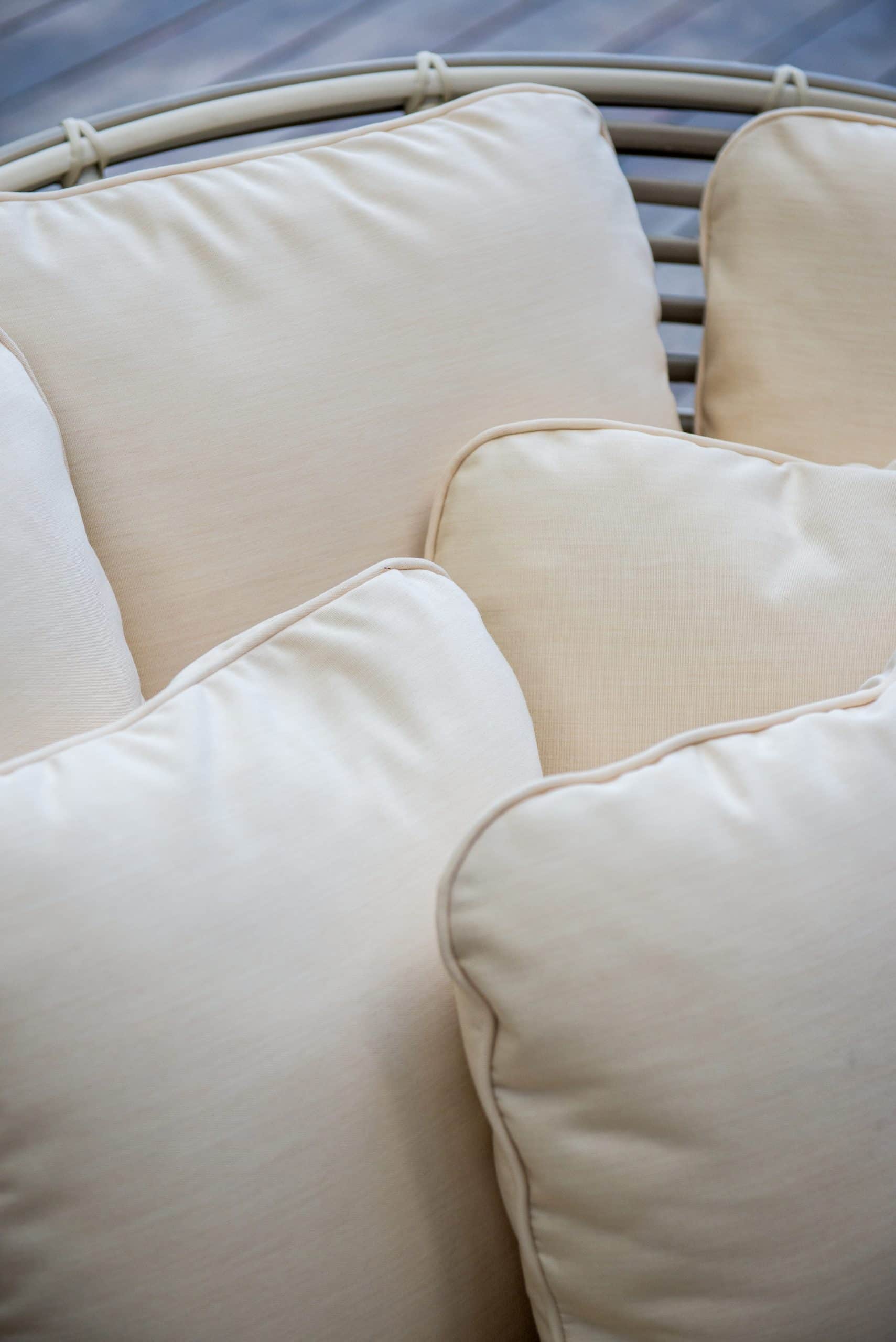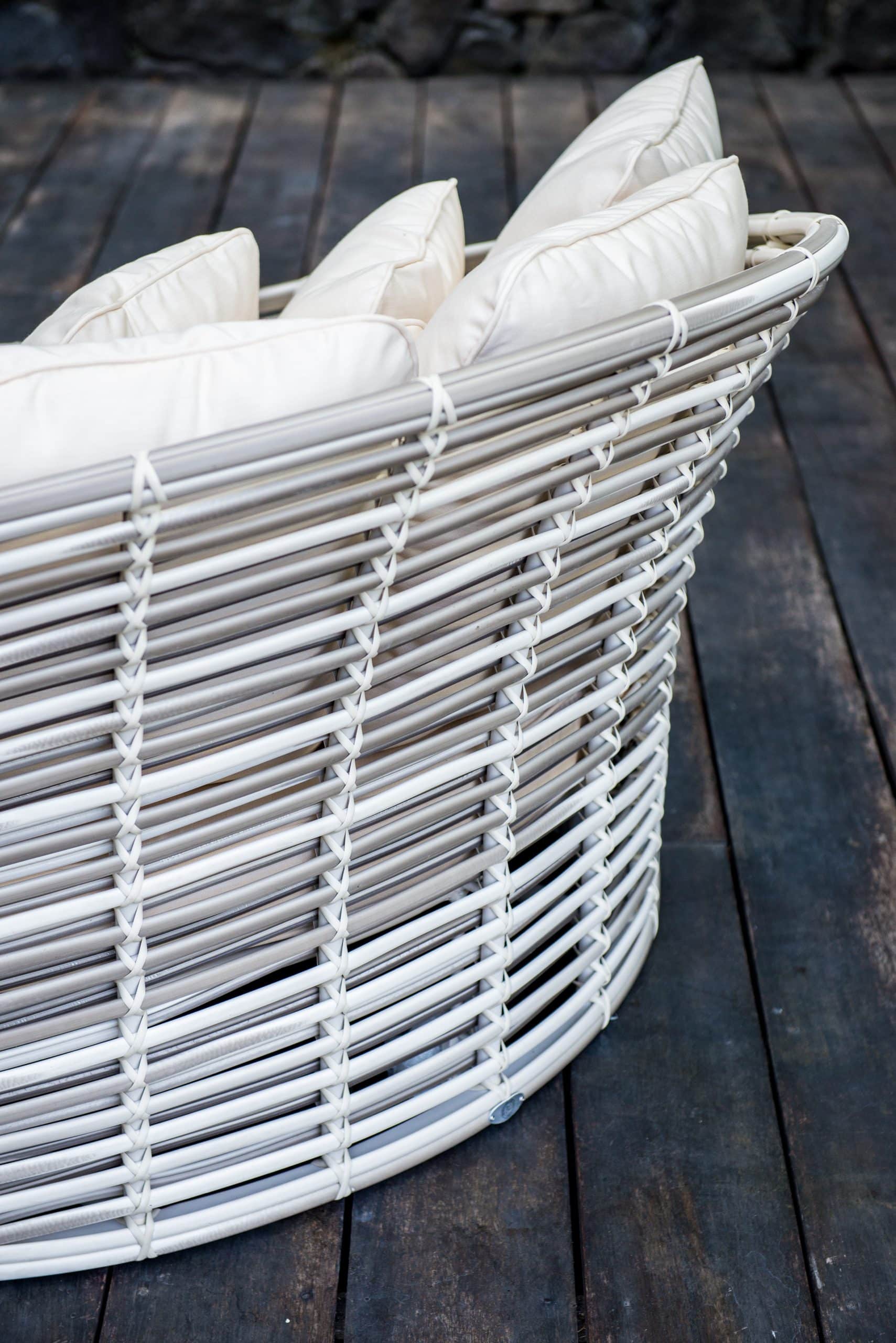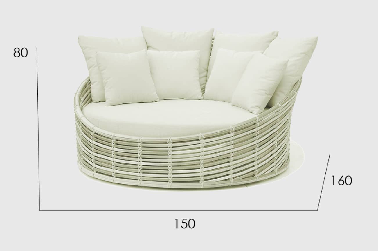 Plecionka wykonana jest ze sztucznego rattanu w kolorach jasnoszarym i mlecznym. Miękkie poduszki są pokryte wodoodporną tkaniną.