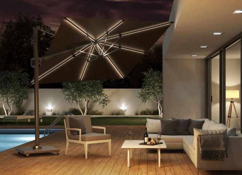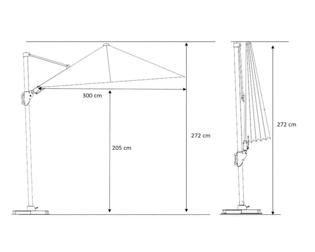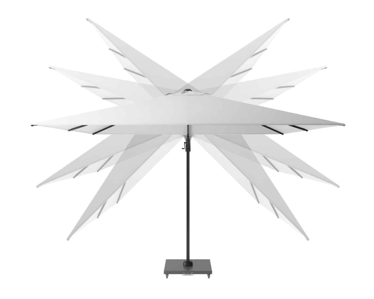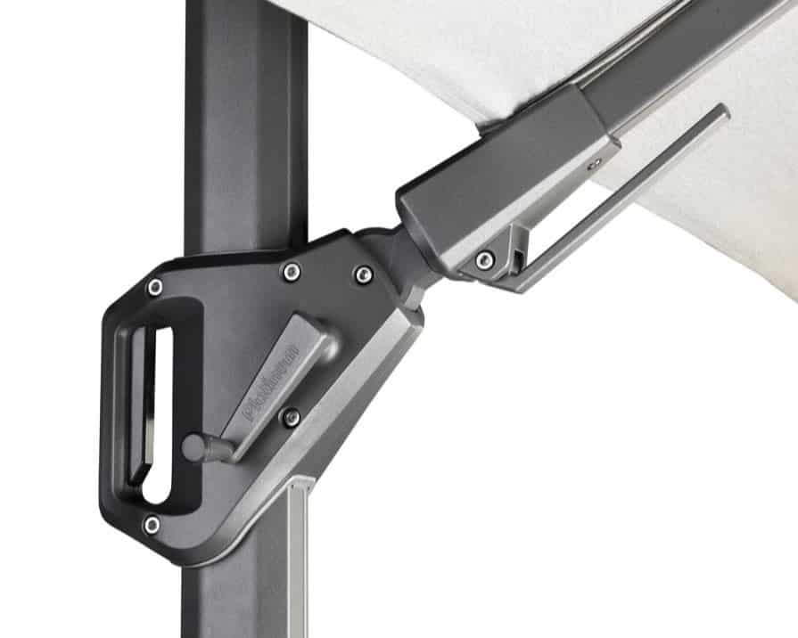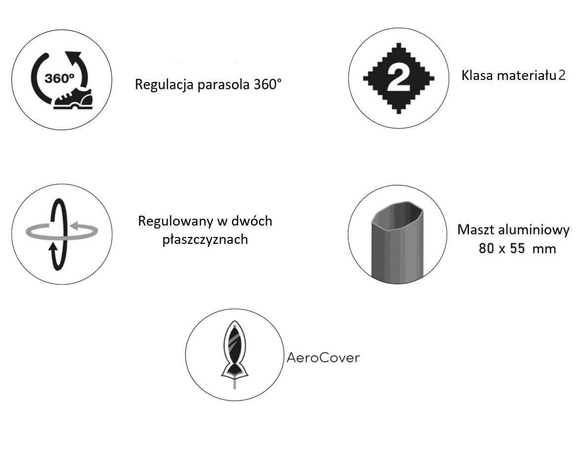 Parasol NEO jest wyposażony w unikalny system T2, który pozwala na łatwe przechylanie go w bok i do tyłu, a także obracanie o 360 stopni. Zawsze będziesz mógł wygodnie siedzieć w cieniu, bez przesuwania parasola. W zestawie znajduje się granitowa podstawa o wadze 90 kg z kółkami ułatwiającymi przemieszczanie, a także ochronne etui do przechowywania parasola, gdy nie jest używany. Kopuła parasola wykonana jest z wysokiej jakości poliestrowej tkaniny o gramaturze 240 gramów z powłoką hydrofobową i antybrudową, która zapewnia wysoki stopień odporności na blaknięcie koloru i została przetestowana na poziomie 7(doskonały). Solidna podpora i odlewany aluminiowy korpus mechanizmu obrotowego zapewniają trwałość i niezawodność konstrukcji.
