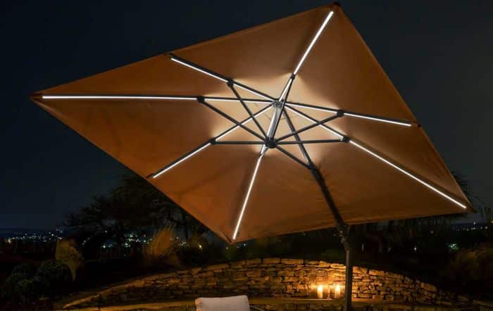 Parasol NEO jest wyposażony w unikalny system T2, który pozwala na łatwe przechylanie go w bok i do tyłu, a także obracanie o 360 stopni. Zawsze będziesz mógł wygodnie siedzieć w cieniu, bez przesuwania parasola. W zestawie znajduje się granitowa podstawa o wadze 90 kg z kółkami ułatwiającymi przemieszczanie, a także ochronne etui do przechowywania parasola, gdy nie jest używany. Kopuła parasola wykonana jest z wysokiej jakości poliestrowej tkaniny o gramaturze 240 gramów z powłoką hydrofobową i antybrudową, która zapewnia wysoki stopień odporności na blaknięcie koloru i została przetestowana na poziomie 7 (doskonały). Solidna podpora i odlewany aluminiowy korpus mechanizmu obrotowego zapewniają trwałość i niezawodność konstrukcji.