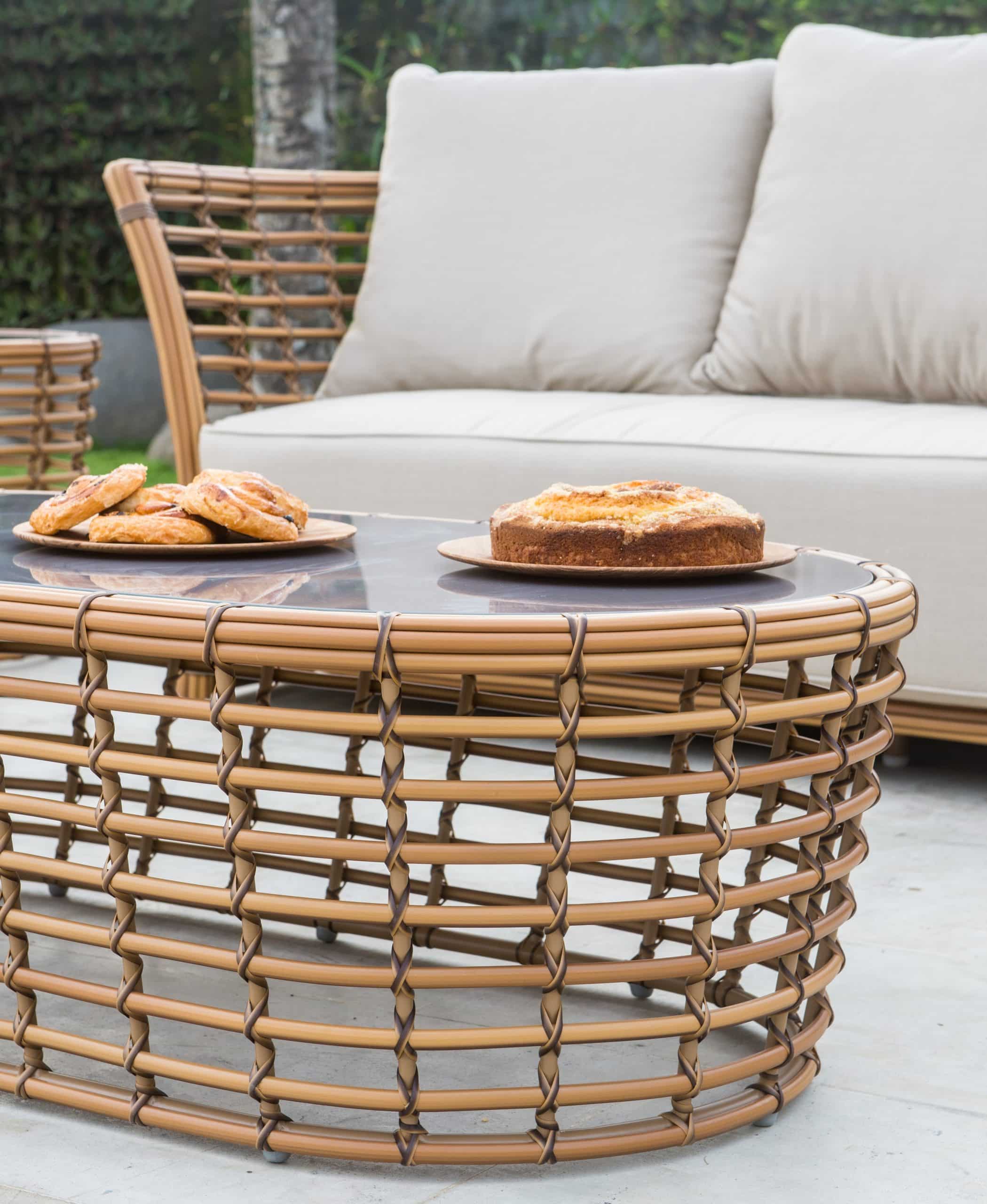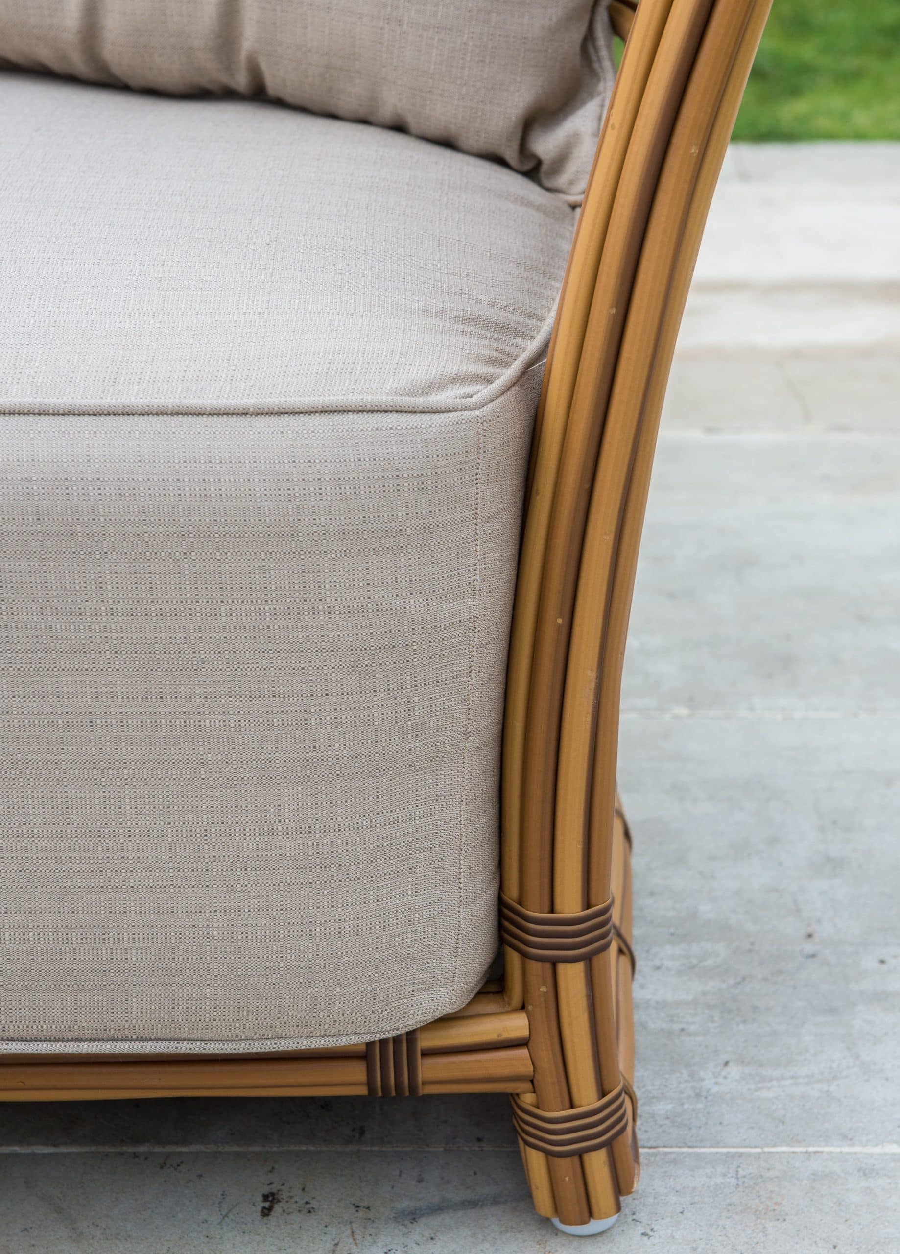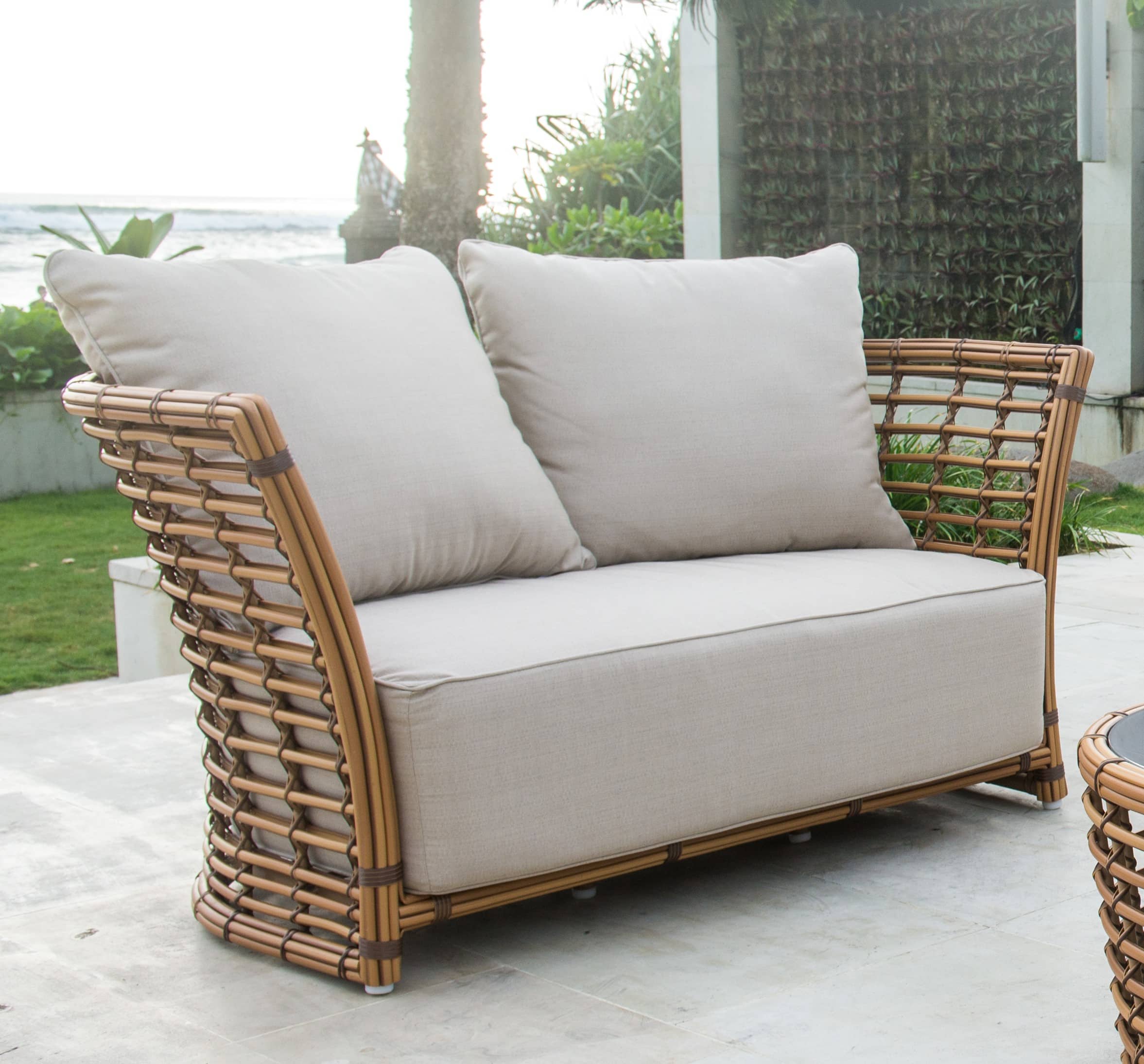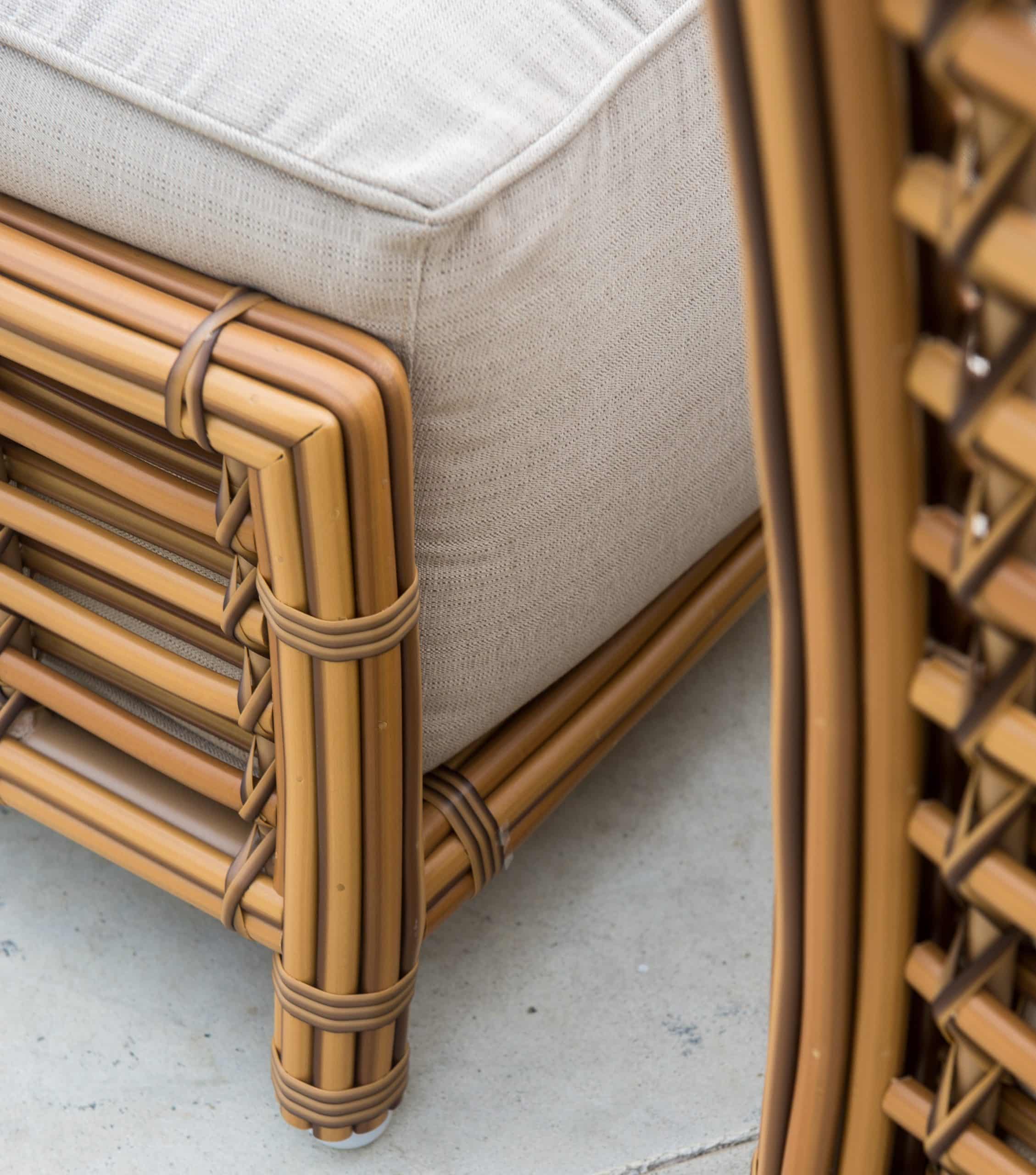 Splot wykonany jest ze sztucznego rattanu w przyjemnym jasnobrązowym kolorze imitującym kolor naturalnego rattanu. Wysokie i miękkie poduszki są pokryte wodoodporną tkaniną
