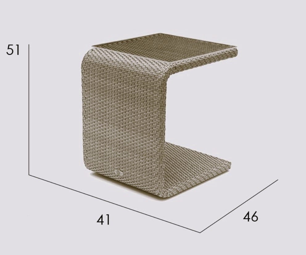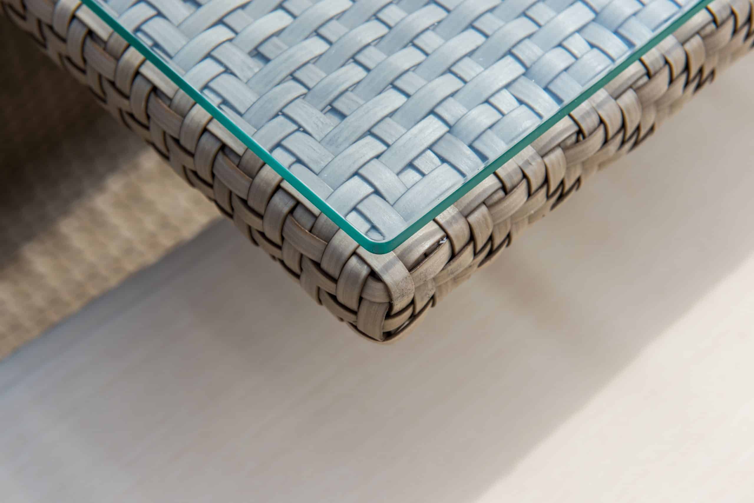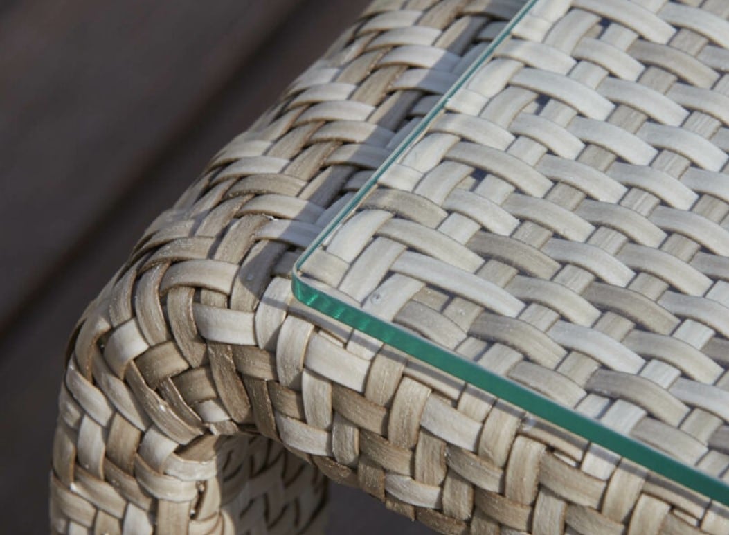 Rama wykonana jest z malowanego aluminium. Splot – technorattan SEASHELL FLAT-FLAT 7 mm, w przyjemnym beżowym kolorze z brązowym odcieniem. Blat stołu to szkło hartowane.