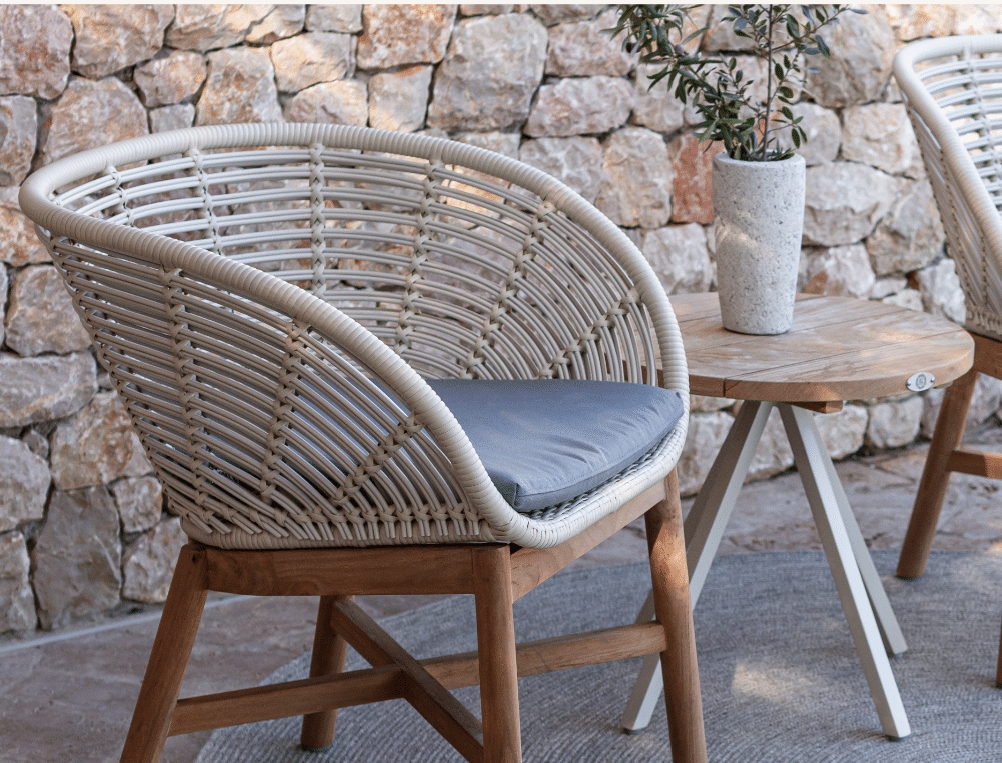 Kolekcja mebli ALASKA to udane połączenie białego technorattanu z elementami naturalnego drewna tekowego oraz grubymi, miękkimi poduchami. Rewelacyjny do ogrodu, na taras oraz do wszystkich wnętrz mieszkalnych.