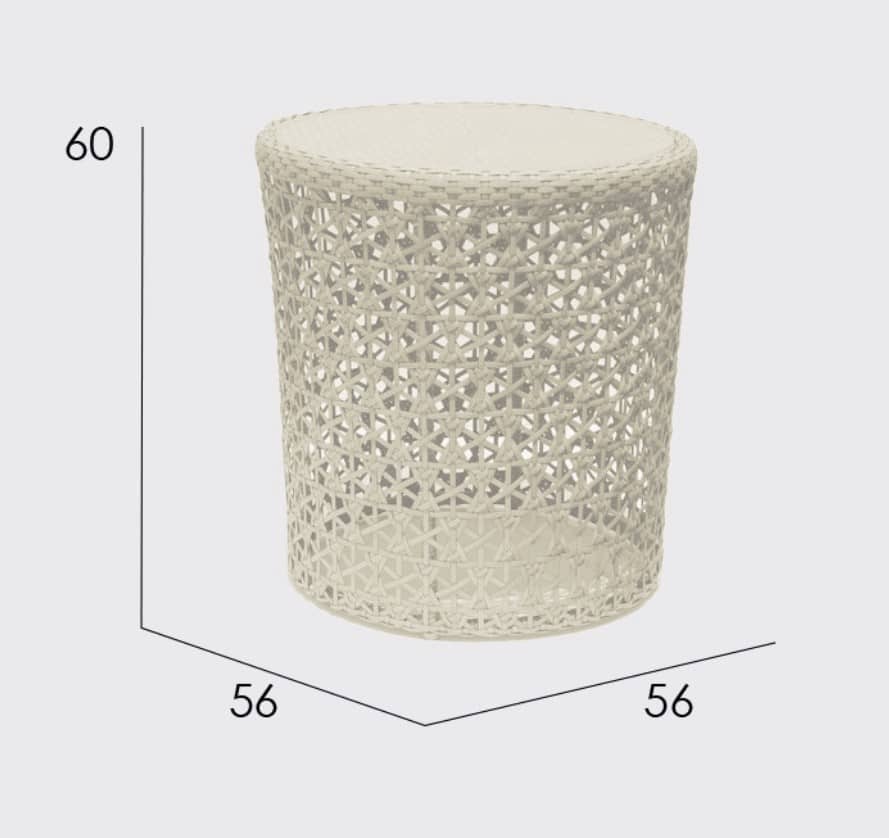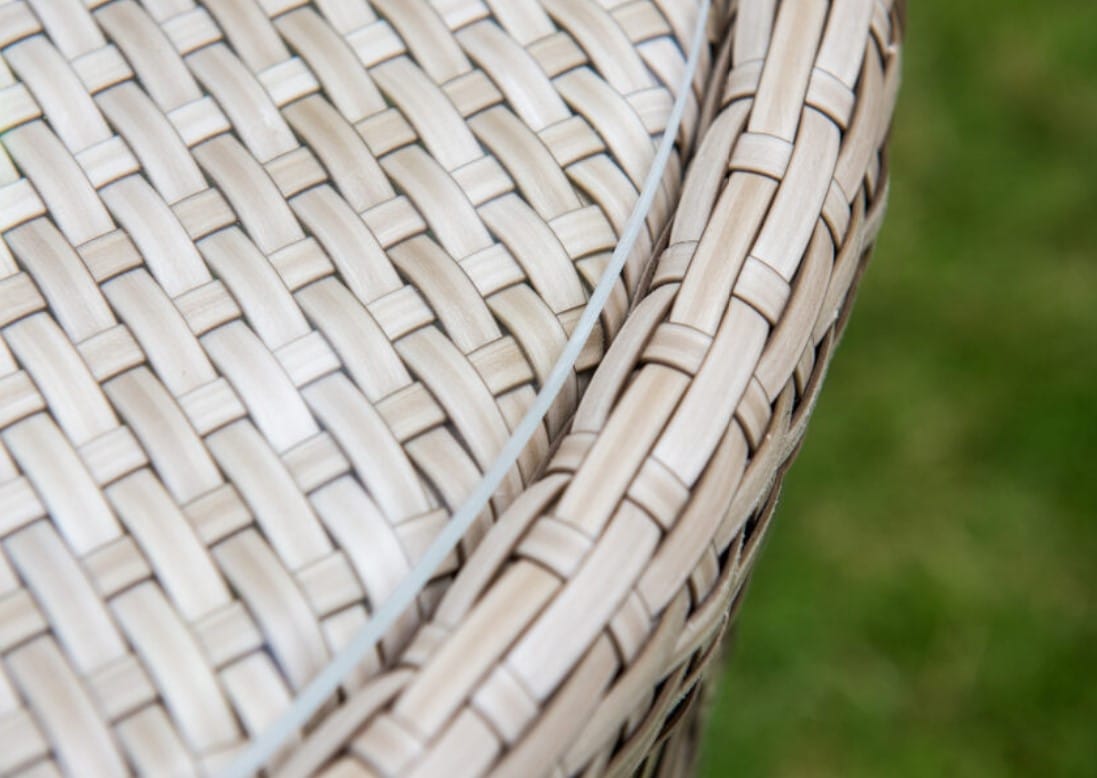 Rama wykonana jest z malowanego aluminium. Splot – technorattan SEASHELL FLAT-FLAT 7 mm, w przyjemnym beżowym kolorze z brązowym odcieniem. Blat stołu to szkło hartowane.