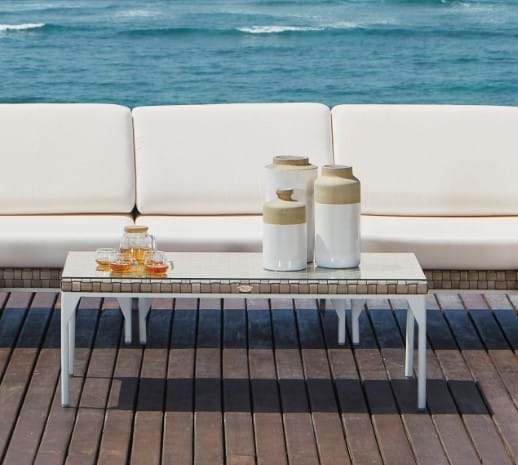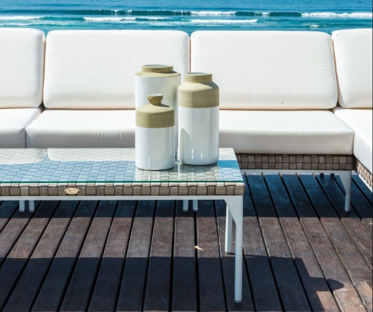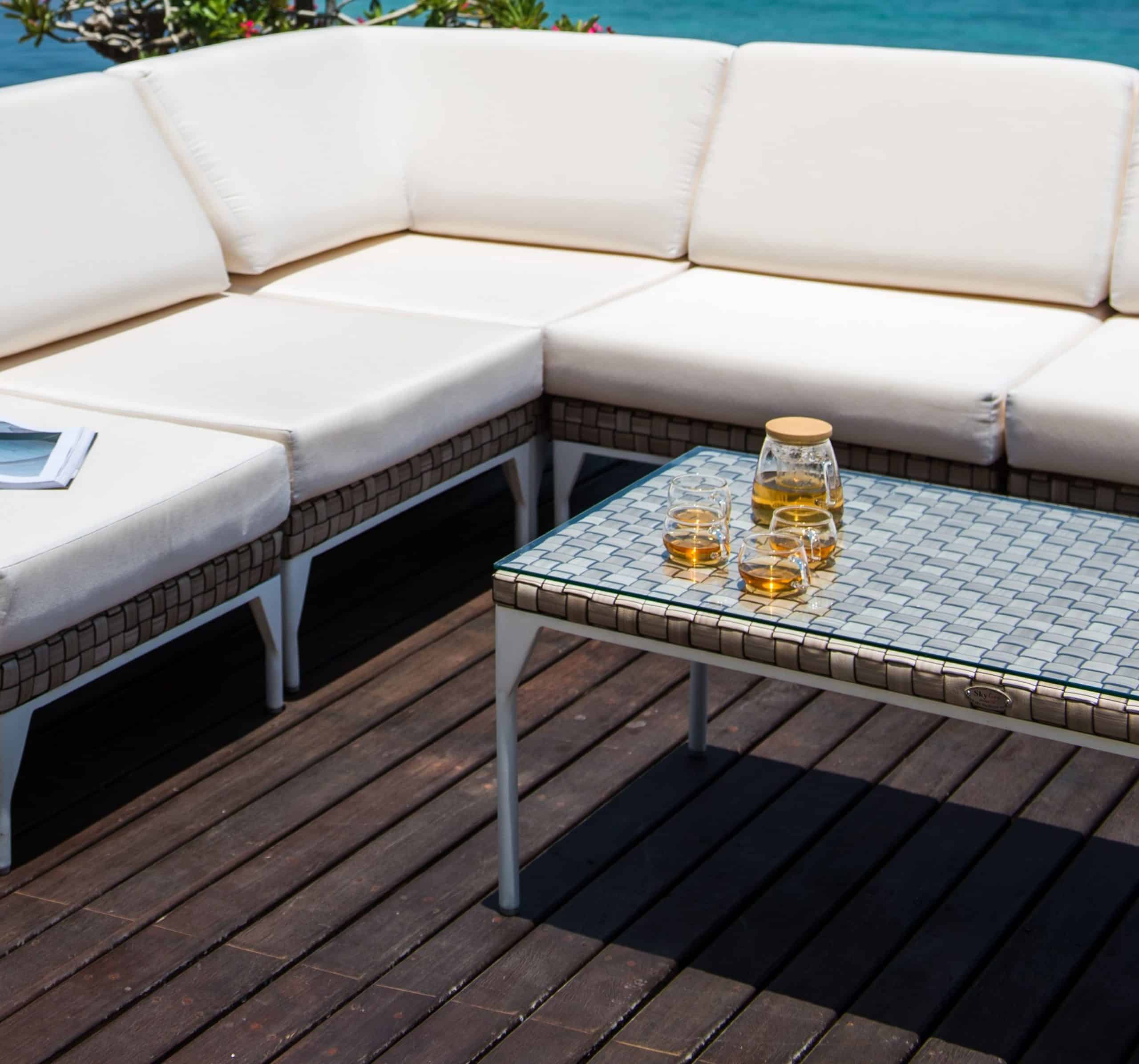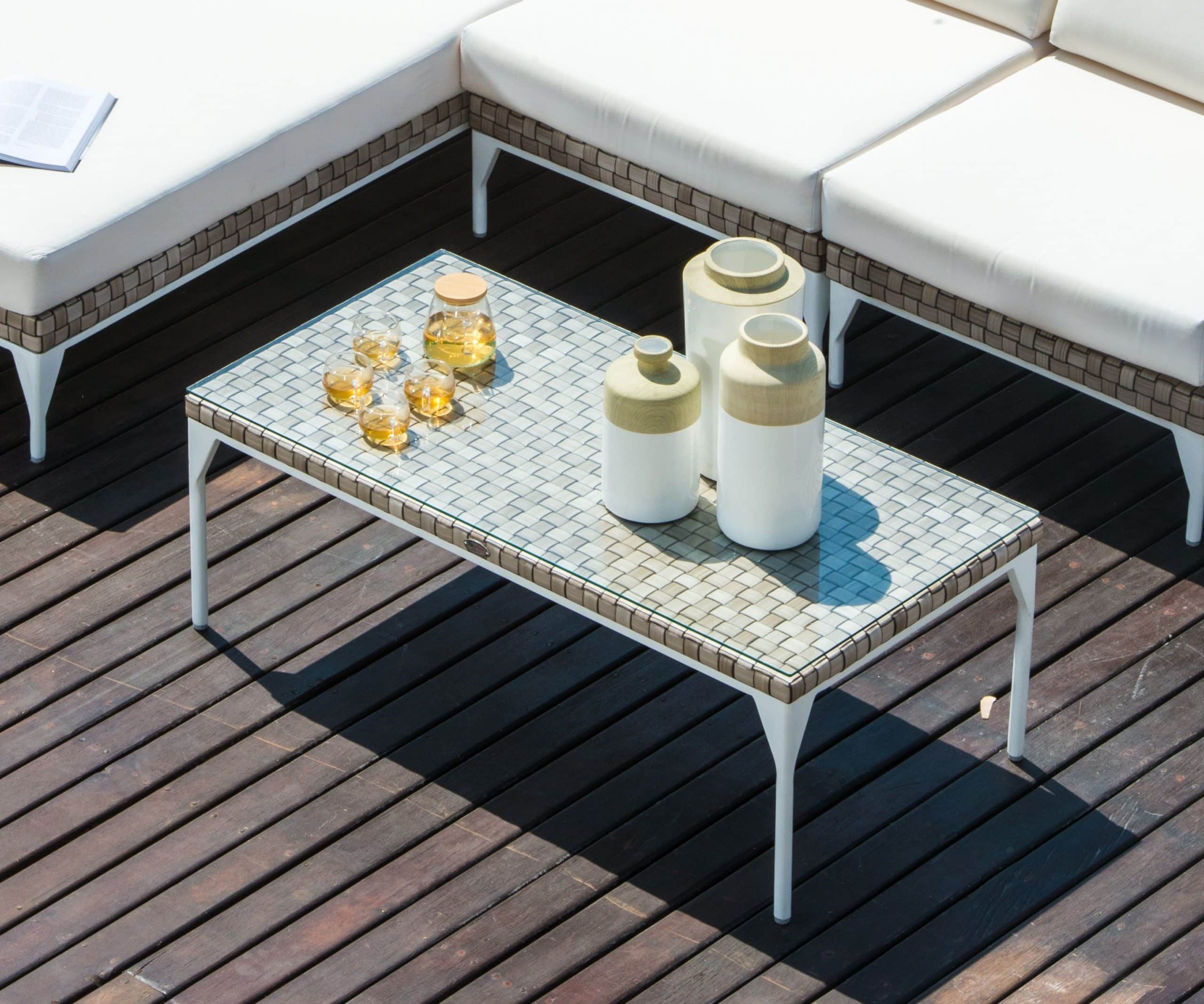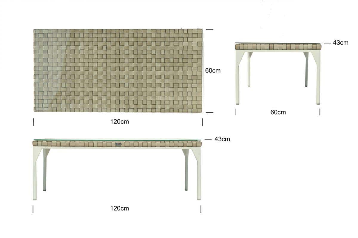 Rama wykonana z aluminium malowanego na biało. Splot wykonany jest z technorattanu SEASHELL FLAT-FLAT 30 mm, w przyjemnym beżowym kolorze z brązowym odcieniem. Blat – szkło hartowane.