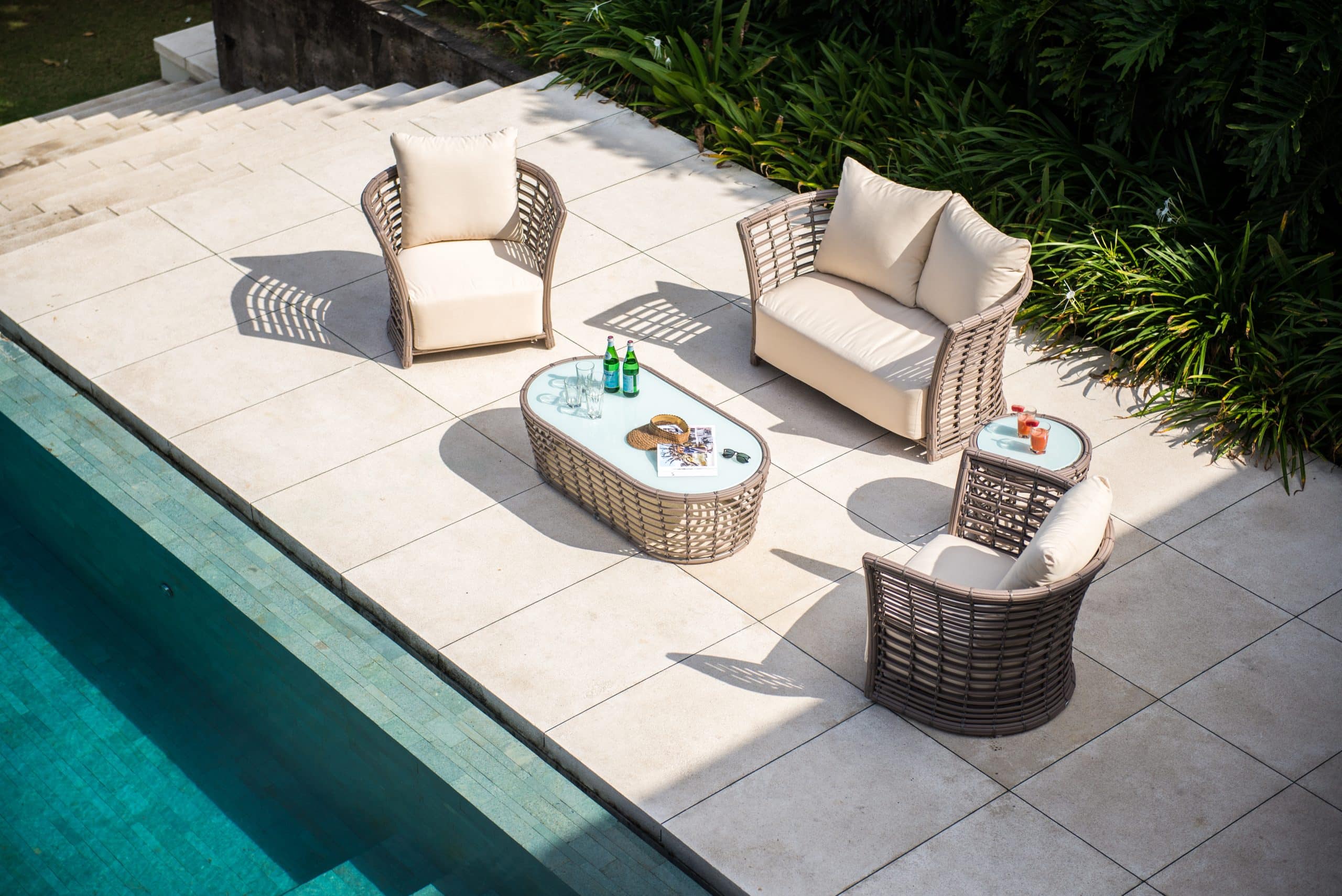 Plecionka – technorattan w kolorach jasnoszarym i mlecznym. Blat wykonany jest z hartowanego szkła, które charakteryzuje się wysoką odpornością na uderzenia, ale w razie potrzeby można go zastąpić powierzchnią ceramiczną.