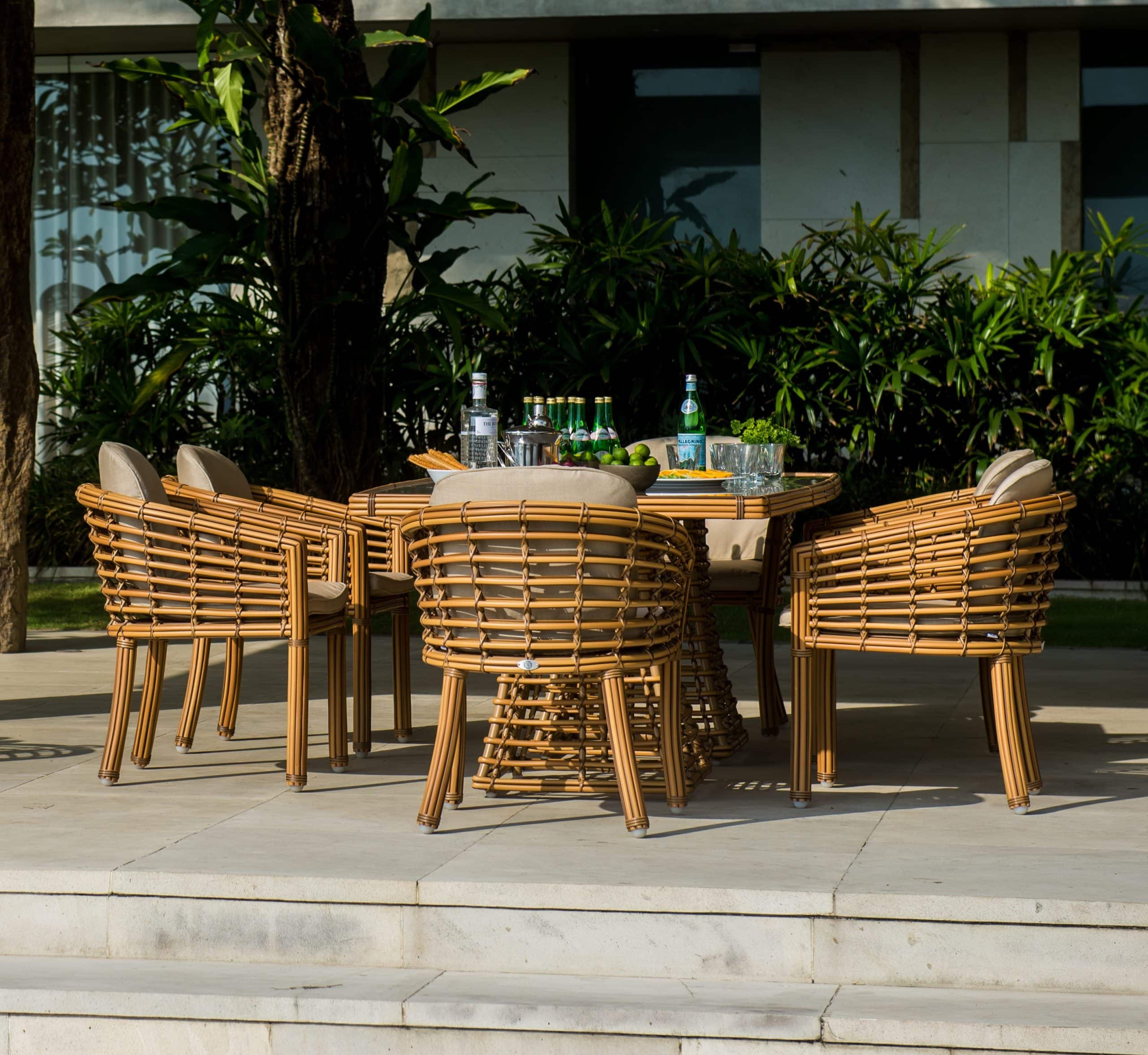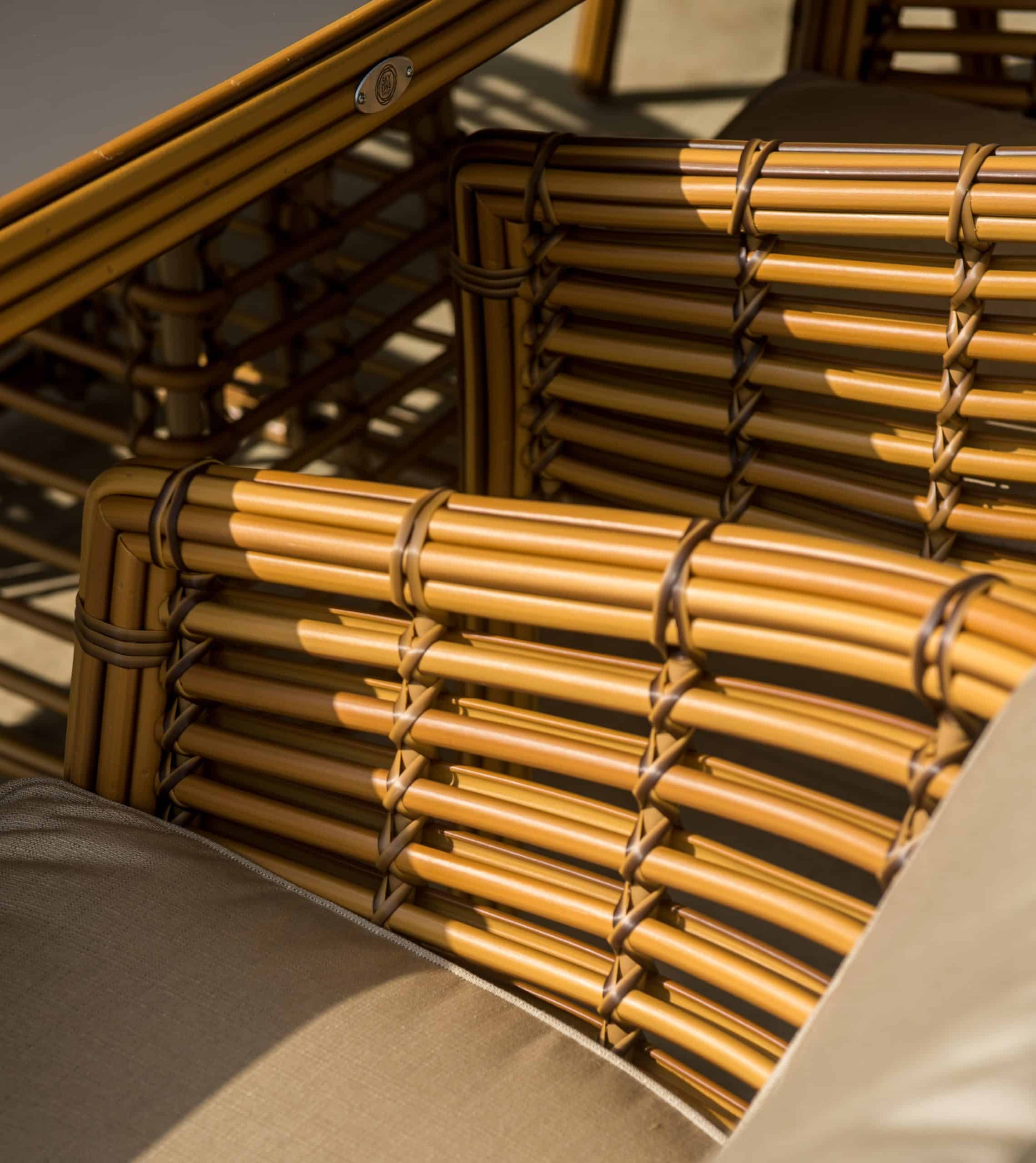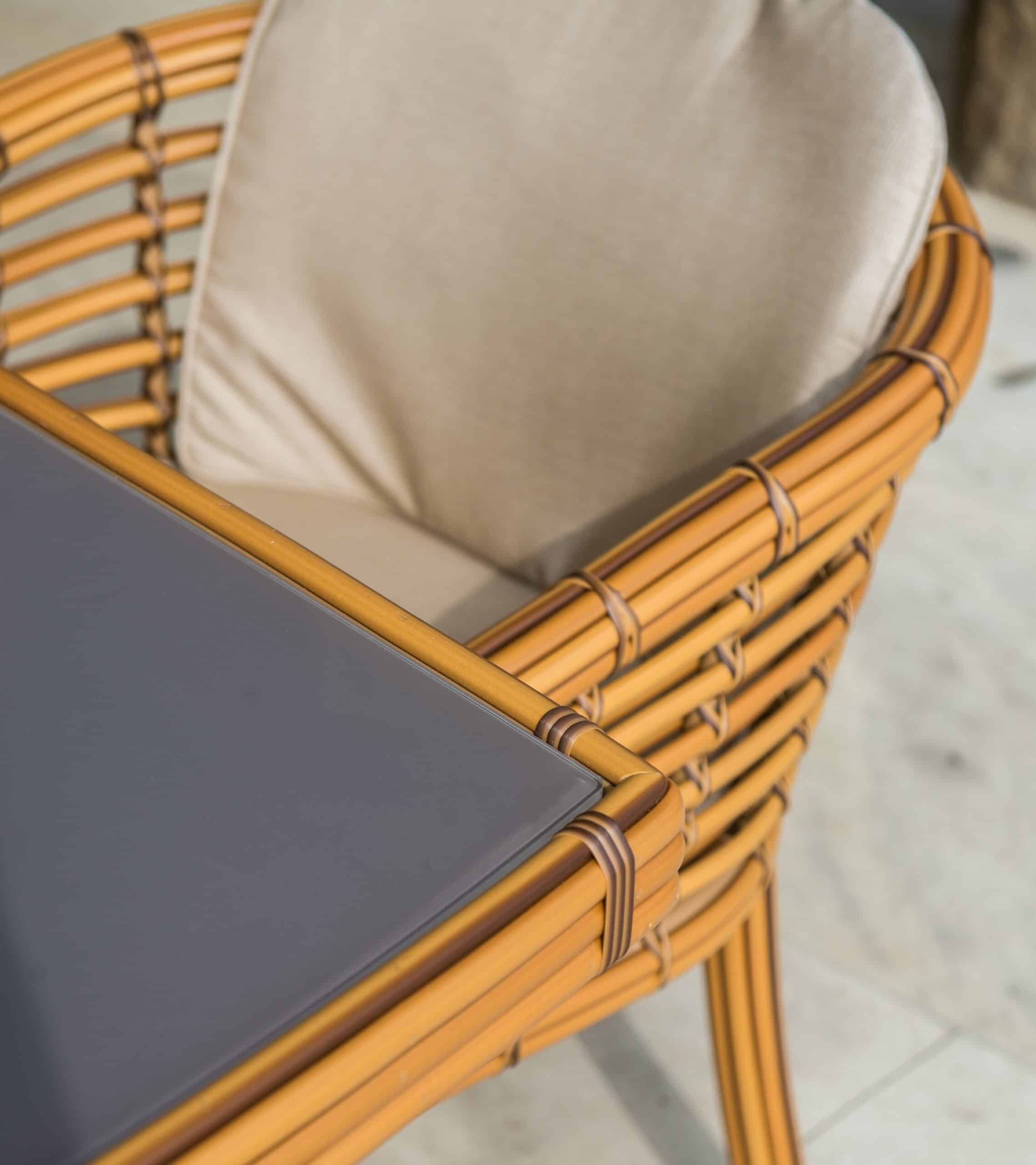 Splot wykonany jest ze sztucznego rattanu w przyjemnym jasnobrązowym kolorze, który imituje kolor naturalnego rattanu. Miękkie poduszki są pokryte wodoodporną tkaniną. Blat stołu może być szklany lub ceramiczny. Konfiguracja zestawu może być zmieniona na życzenie kupującego