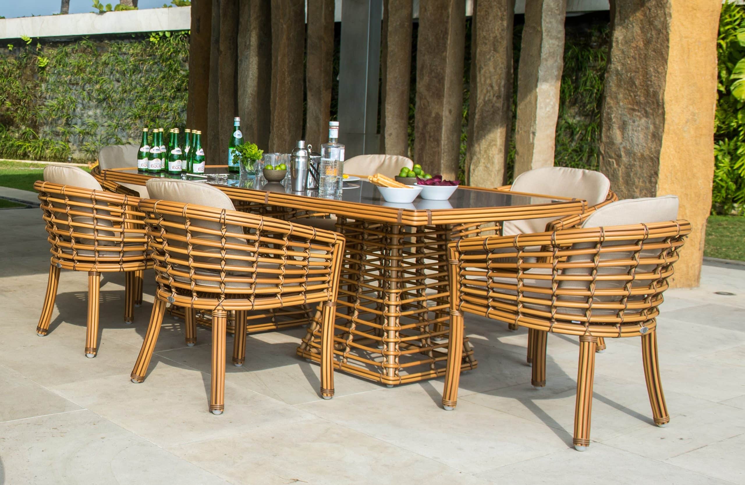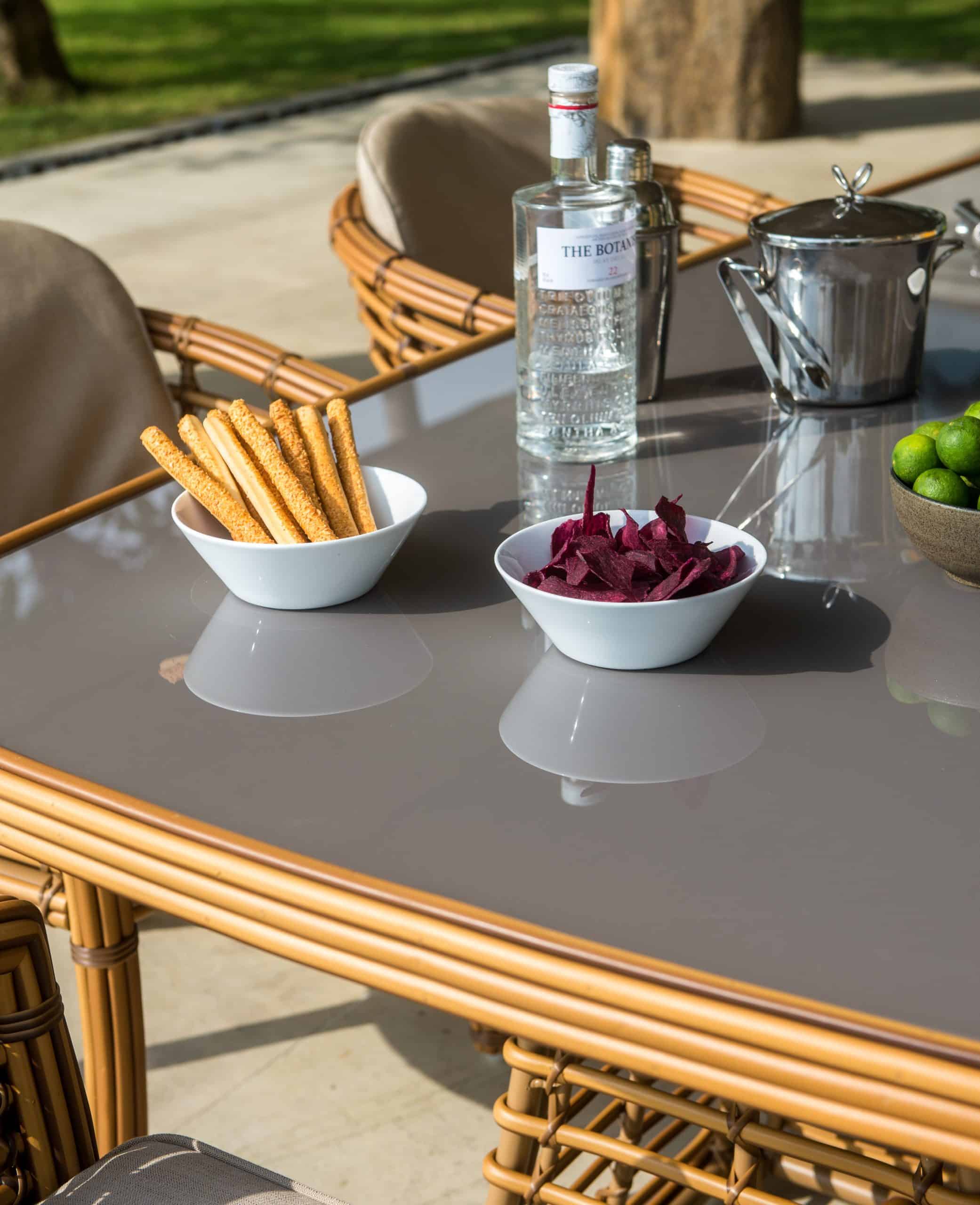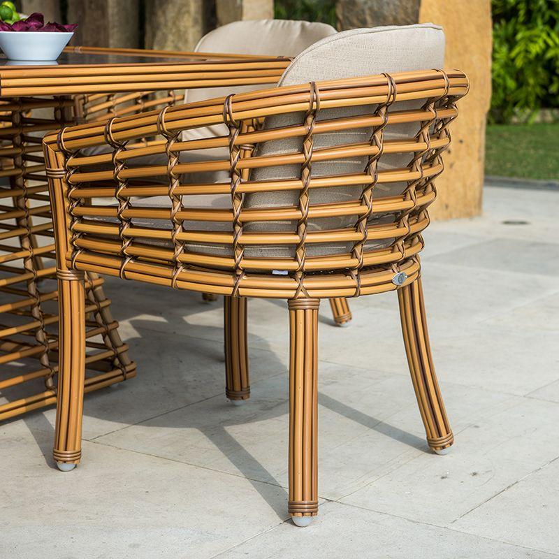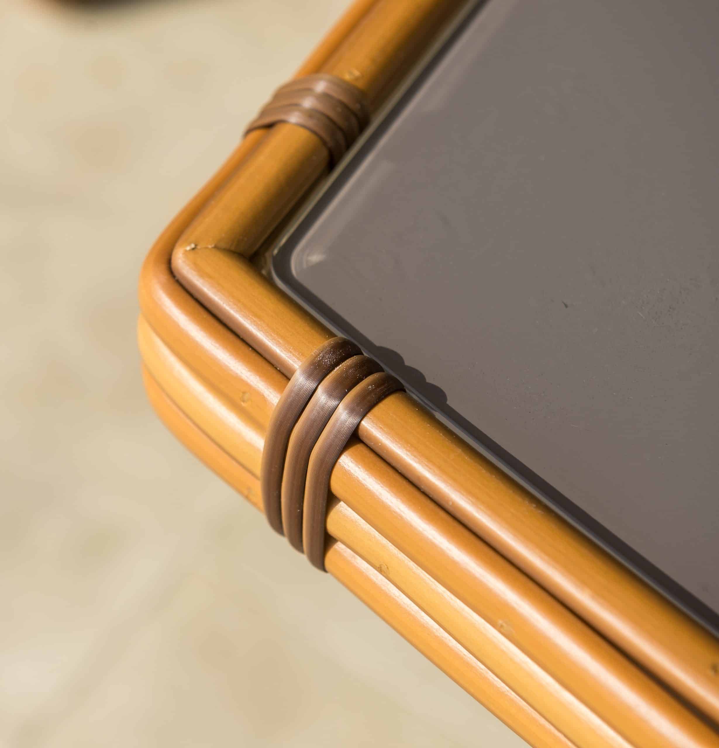Splot wykonany jest ze sztucznego rattanu w przyjemnym jasnobrązowym kolorze, który imituje kolor naturalnego rattanu. Miękkie poduszki są pokryte wodoodporną tkaniną. Blat stołu może być szklany lub ceramiczny. Konfiguracja zestawu może być zmieniona na życzenie kupującego