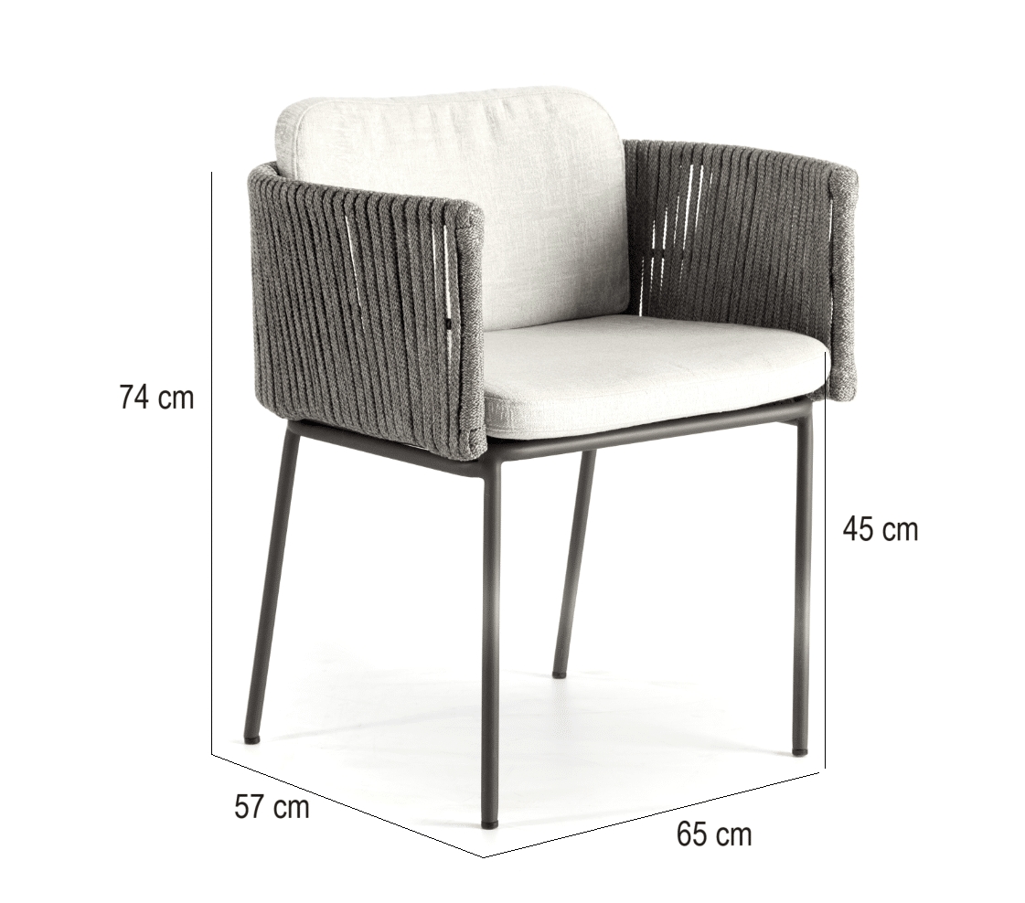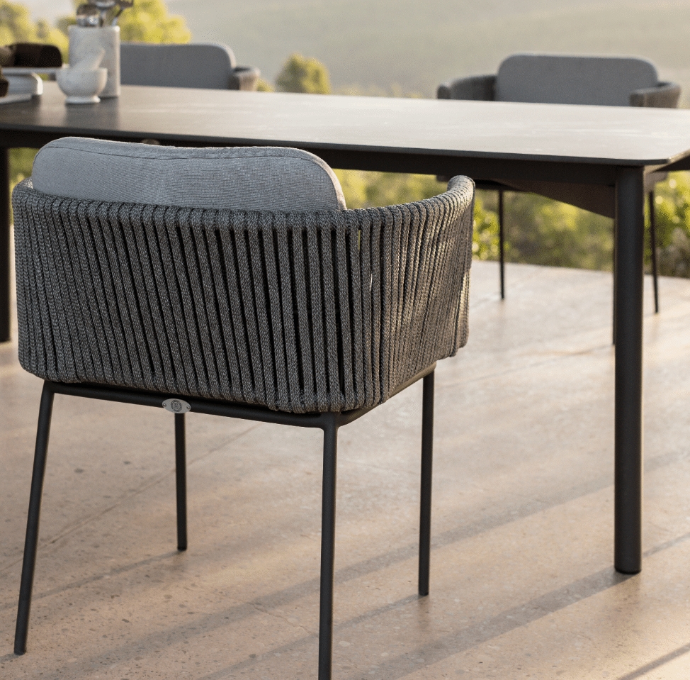 Rama wykonana jest z malowanego aluminium, kolor CARBON MATTE. Splot – sznurek poliestrowy LIGHT GREY 16×5 mm. Wysokie i miękkie poduszki są pokryte wodoodporną tkaniną. Blat stołu – gres porcelanowy. Konfiguracja zestawu może być zmieniona na życzenie kupującego.