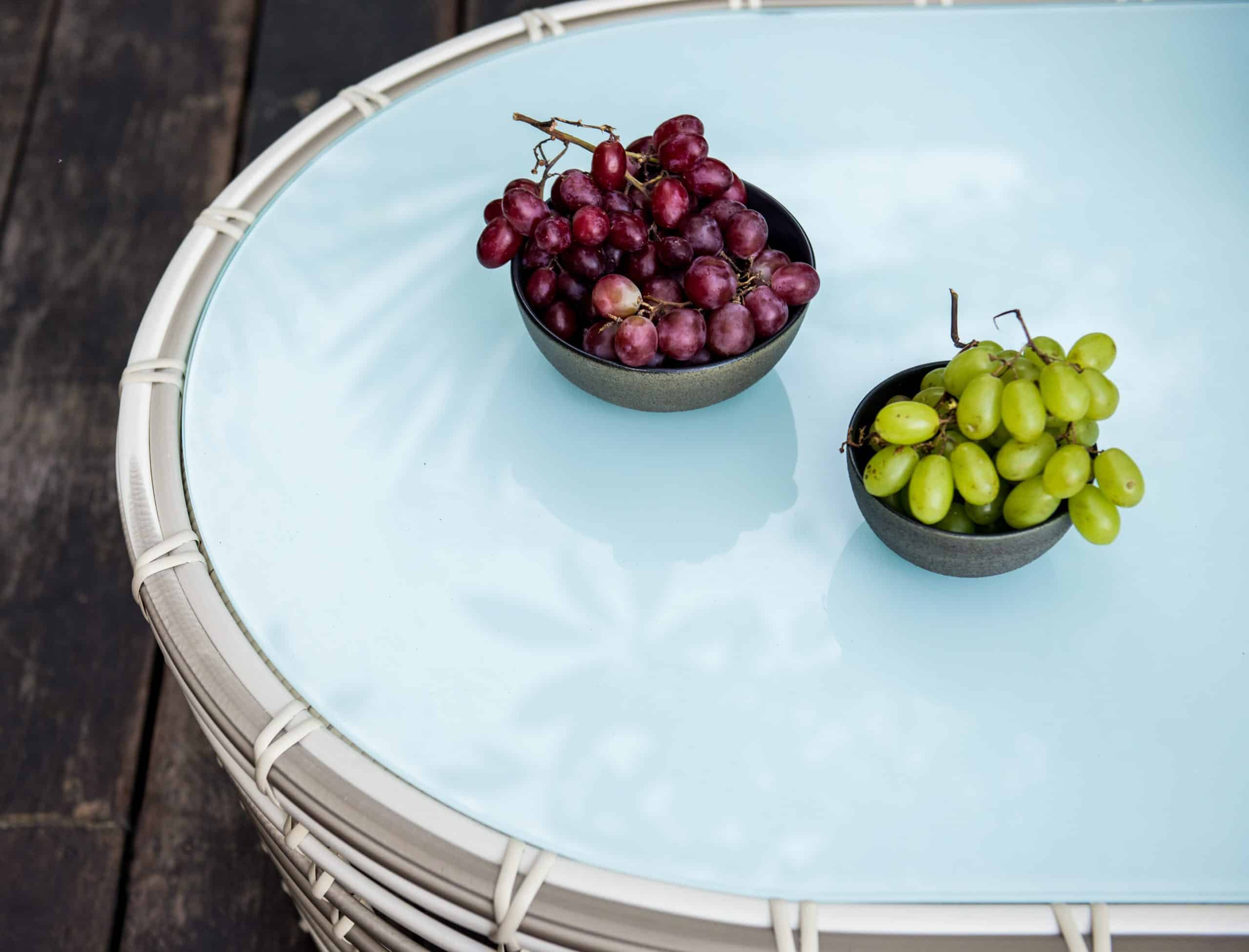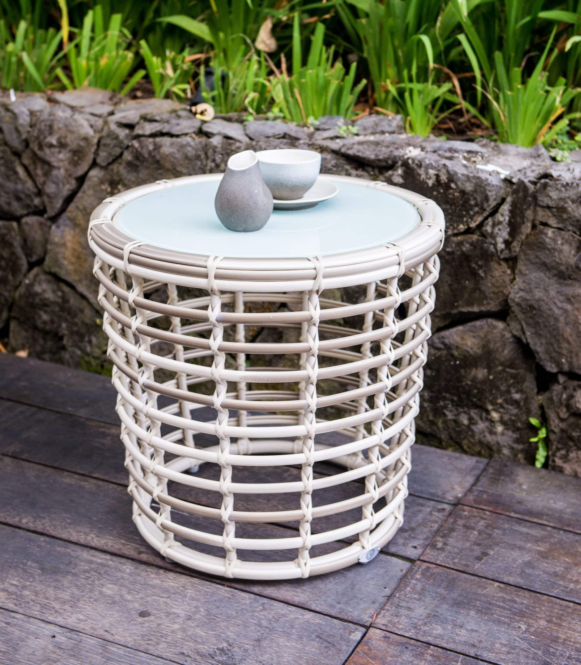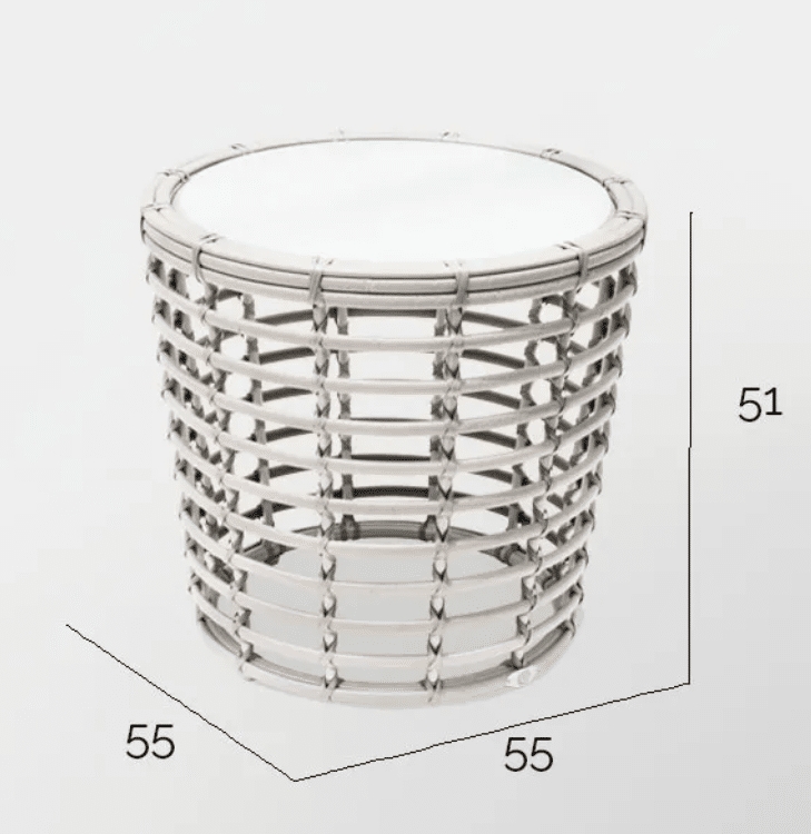 Splot wykonany jest z technorattanu w kolorach jasnoszarym i mlecznym. Wysokie i miękkie poduszki są pokryte wodoodporną tkaniną. Blaty stolików kawowych i stolików do serwowania mogą być wyposażone w szklane lub ceramiczne powierzchnie na życzenie kupującego. Konfiguracja zestawu może być zmieniona na życzenie kupującego